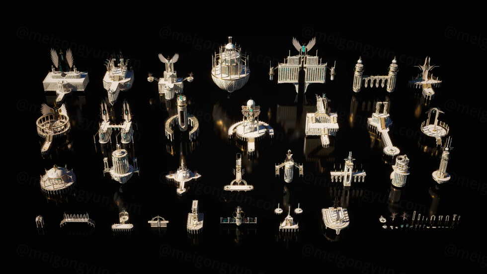 探索拥有美丽华丽图案、天使雕塑、黄金和大理石饰面、翡翠宝石和令人瞠目结舌的建筑的精灵上流社会的皇家城市,您可以使用这些 3D 模型建造嵌入山腰的神话城堡或城堡天空中有由魔法驱动的悬浮庭院。