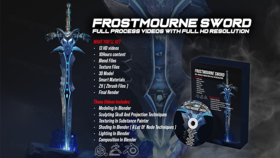 霜之哀伤之剑全过程视频。10 小时的内容和文件,您将学到很多建模、雕刻、着色和渲染方面的好技术,您还将获得 3d 模型 + 此包中使用的智能材料