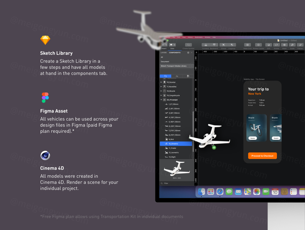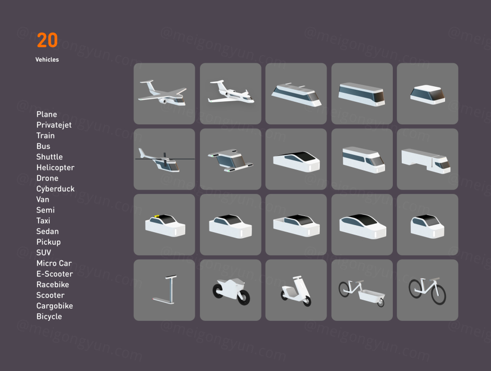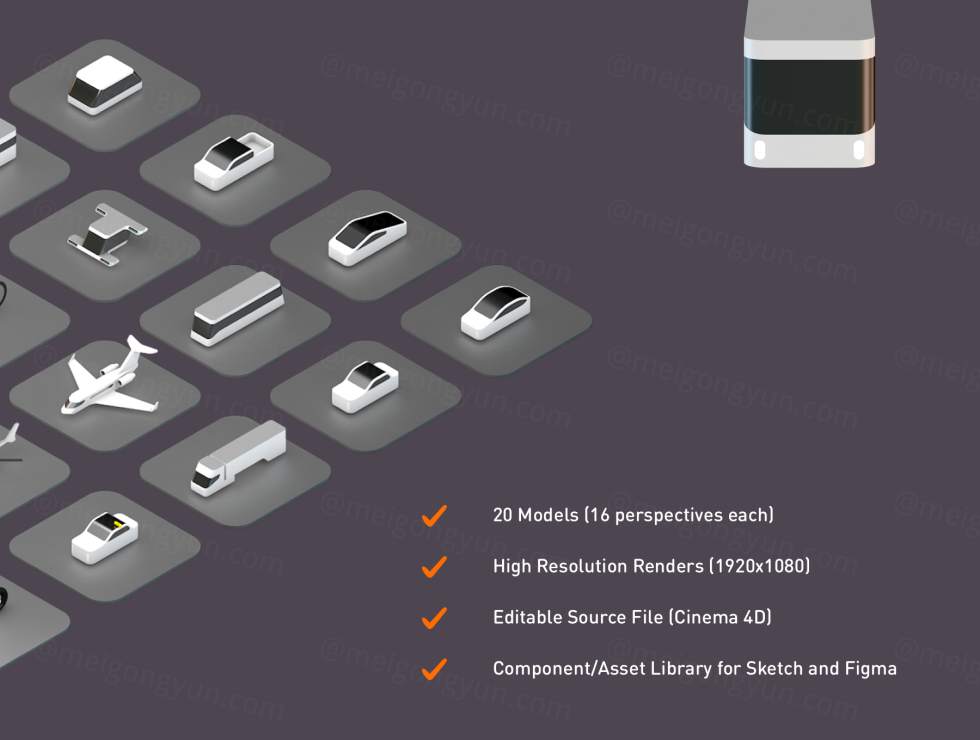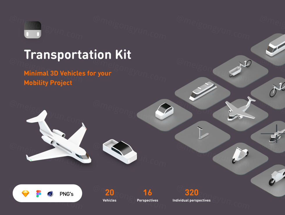 运输工具包由 5 个类别的 20 辆车组成: 飞机、乘用车、公共交通工具、两轮车和半挂车。 运输工具包适用于: - 草图库 - Figma 资产库(资产功能需要付费计划) - Cinema 4D - 您的任何应用程序、印刷品和网站(包括 PNG 文件) 安装指南都在下载文件夹中 (PDF)。