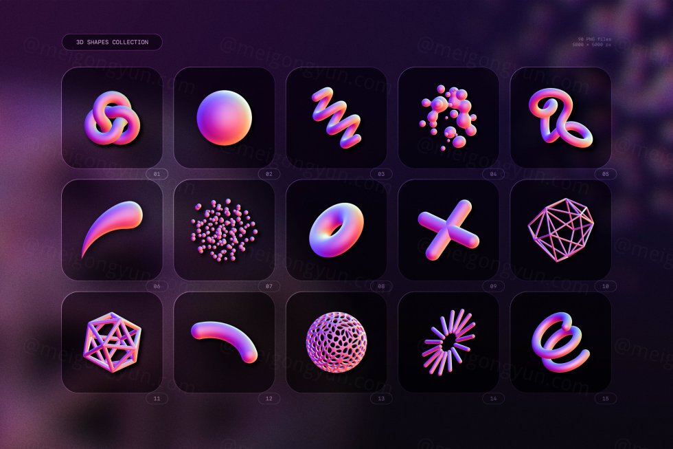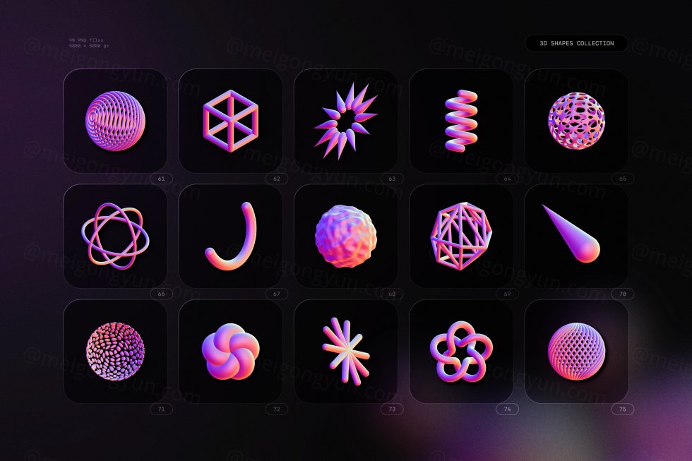 在此包中,您会发现 90 个高分辨率 3D 渲染,以 5000×5000 像素 PNG 文件形式提供。由于每个元素都与其背景隔离,因此您可以从这个庞大的库中随意挑选,然后将您选择的 3D 形状拖放到您的作品中。兼容各类设计软件!