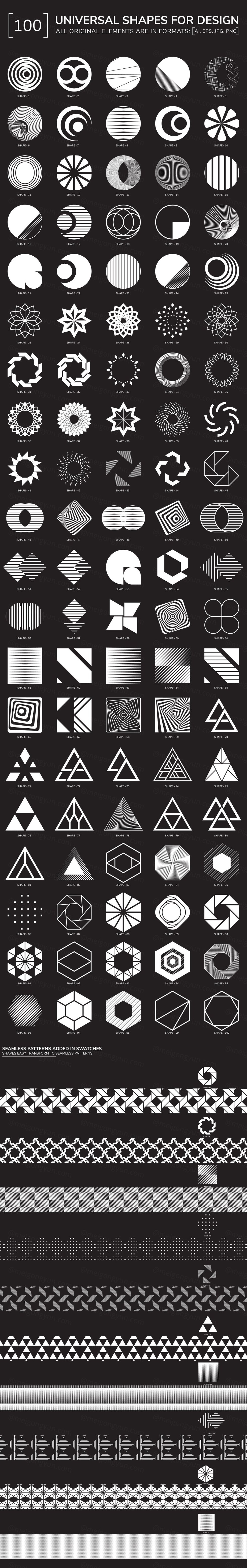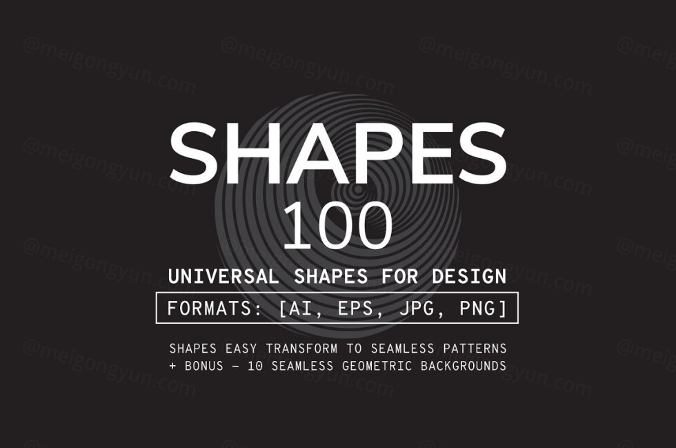110 个 JPG 文件(100 个形状 + 10 个无缝图案),5000x5000 像素,300 dpi,RGB
