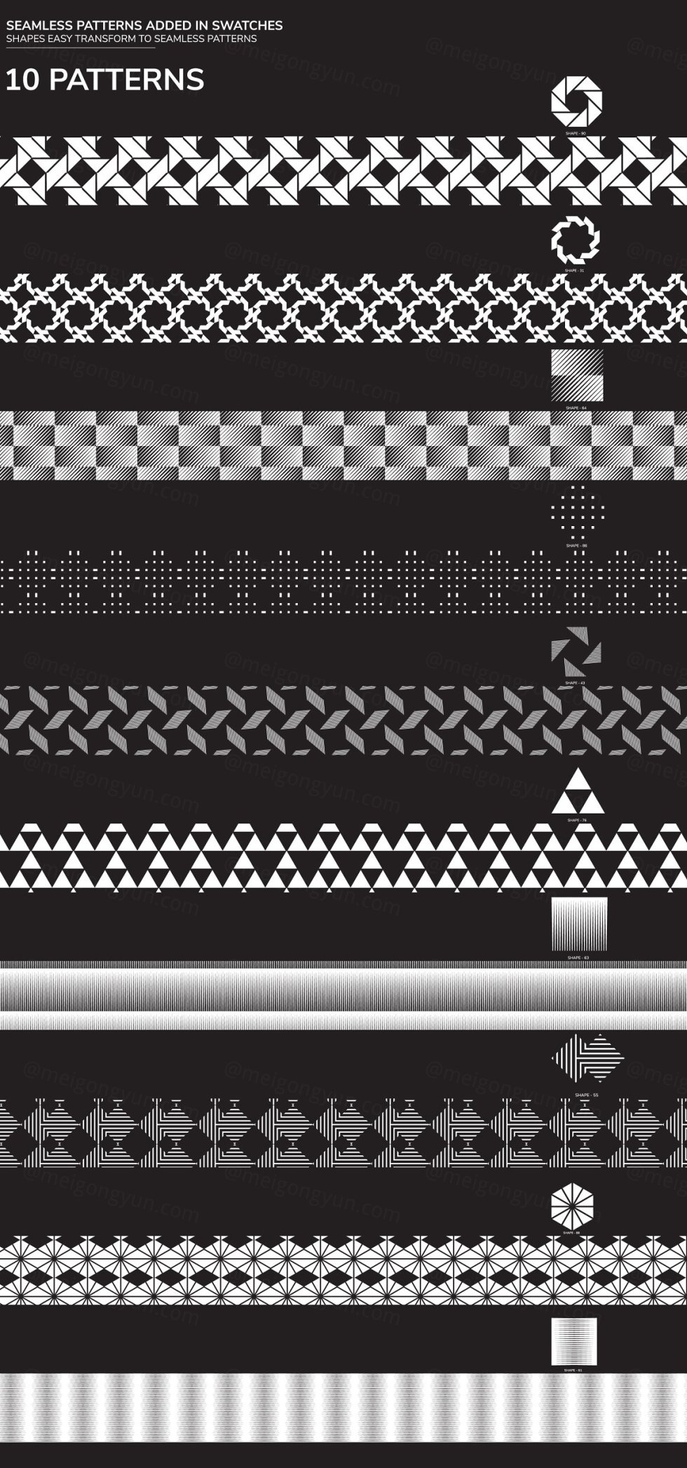 1 个 AI 文件(100 种形状 + 10 种无缝图案),RGB