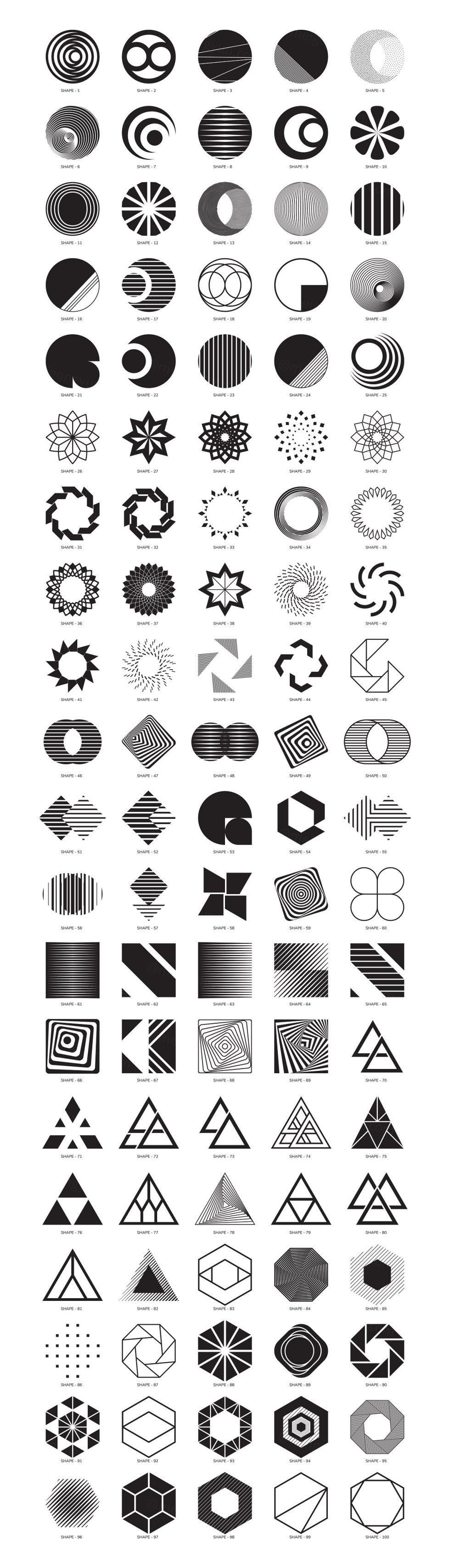 为您的最佳项目设置 100 个单独的几何形状 +BONUS - 10 种无缝图案。所有形状都可以轻松转换为无缝图案。黑白通用矢量几何元素适用于标志设计、名片、品牌书籍、摄影、海报、明信片、图案等。