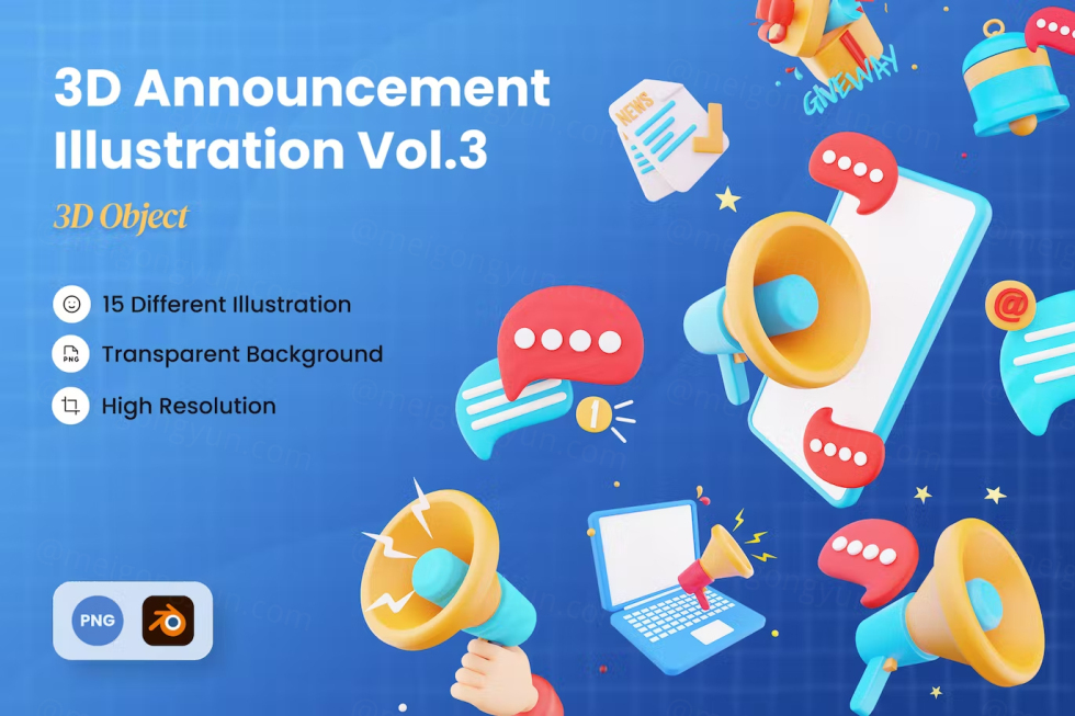 使用这些用爱和热情制作的公告 3D Ilustration 升级您的项目。非常适合您的登陆、应用程序、演示文稿和其他项目。您可以轻松更改搅拌机的颜色和质地,使其与您的品牌指南完美匹配。 强调 15个独特的3D插图 15.png 15.混合 有组织的层搅拌器 高分辨率 PNG(3000 x 3000 像素)