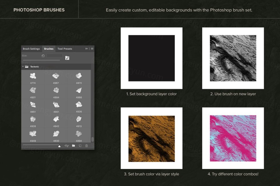 Photoshop 笔刷提供了更大的灵活性,可以使用自定义颜色、渐变等创建您自己的纹理背景。