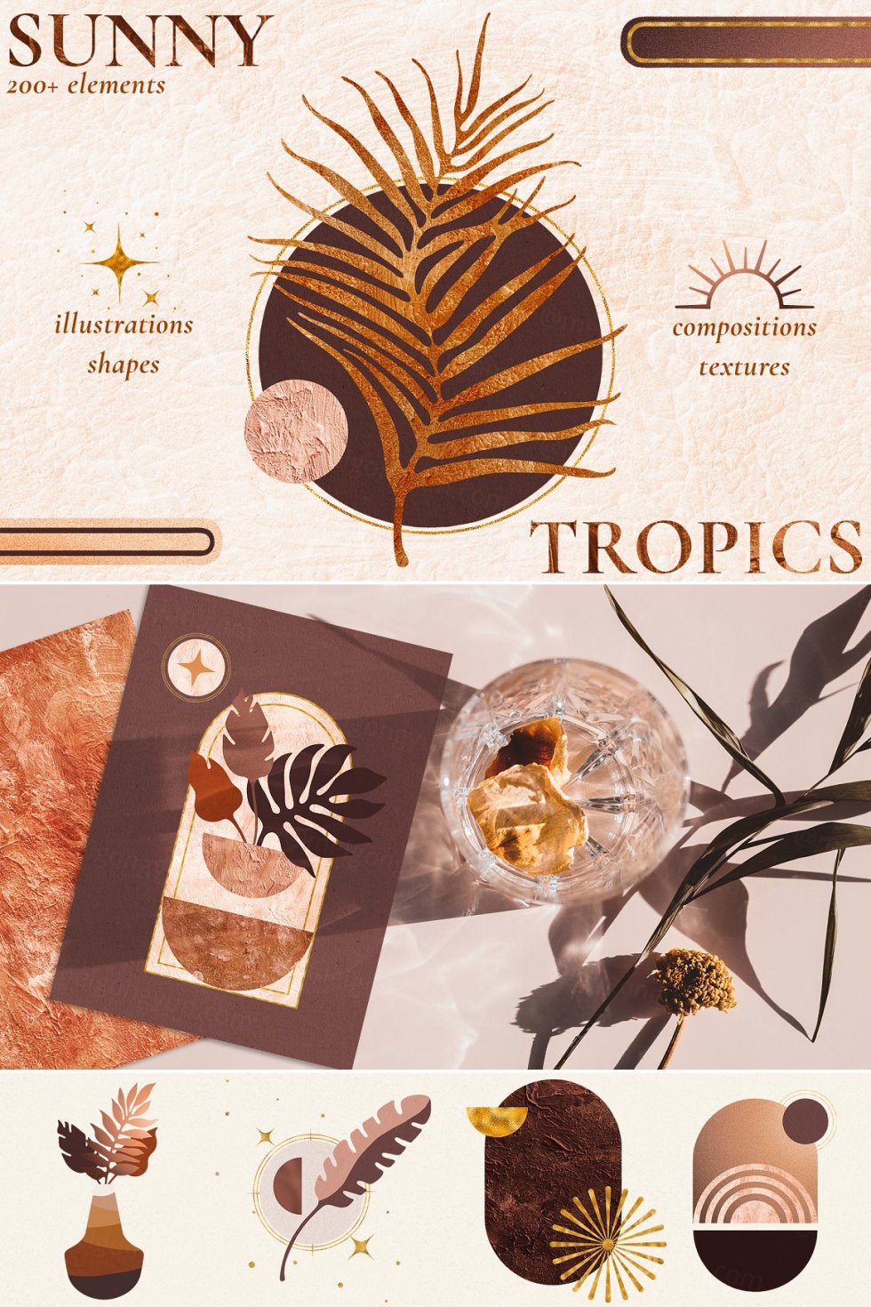 热带树叶和抽象形状 - 一个抽象图形集合,包含 200 多种元素,包括抽象热带树叶、花瓶、太阳和星星、几何形状、丙烯酸、纸和颗粒状渐变纹理以及预制抽象构图。