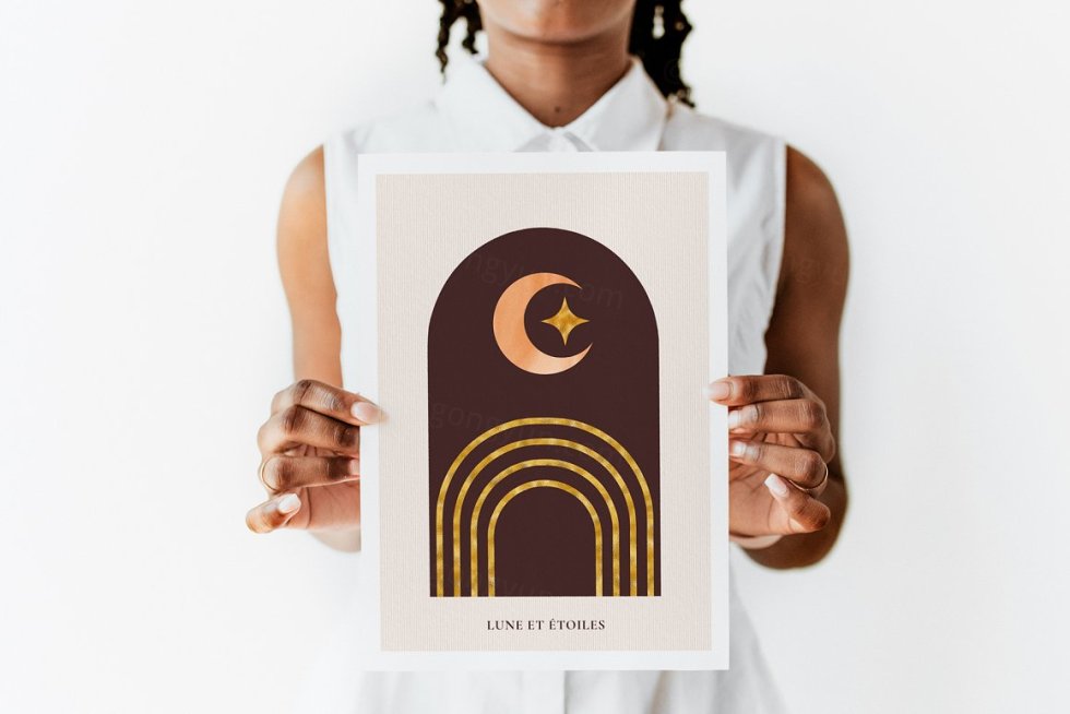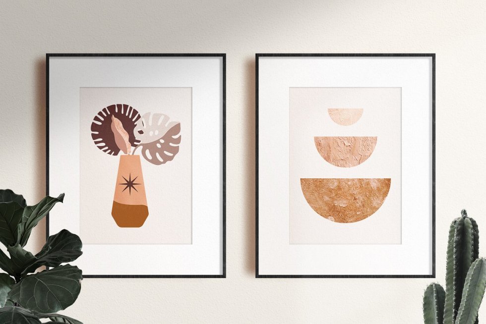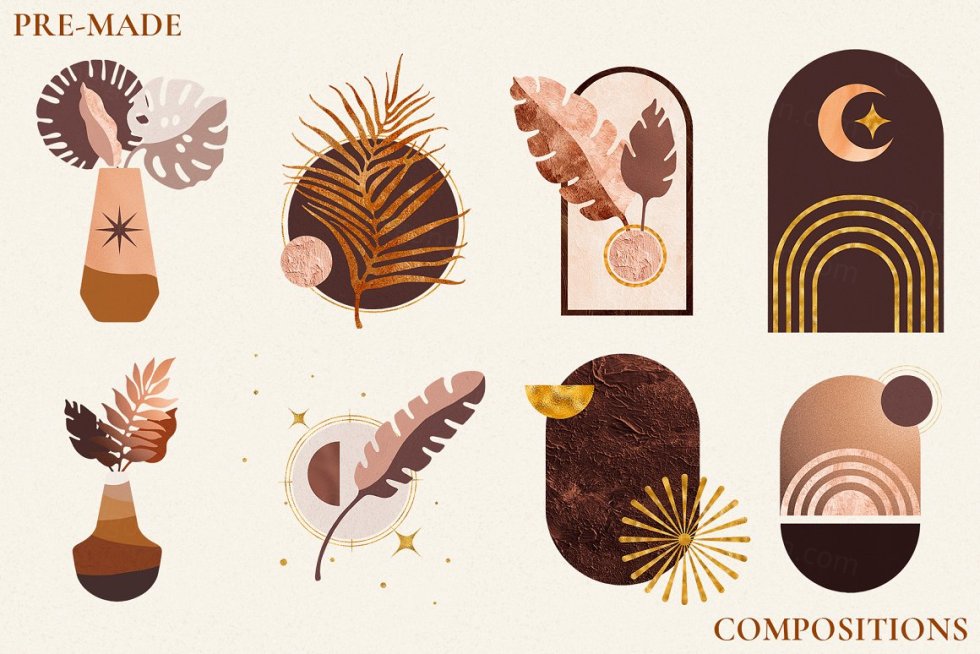 145 幅抽象插图-几何形状、太阳、月亮、星星、热带树叶和花瓶,以下列格式提供: