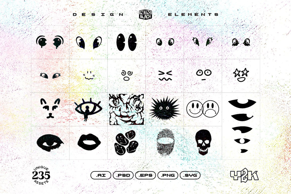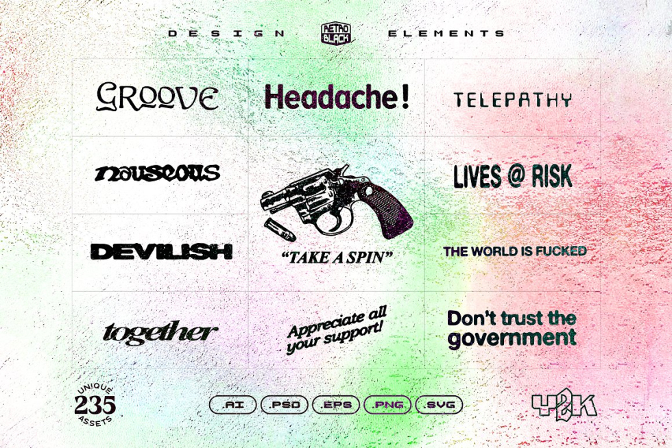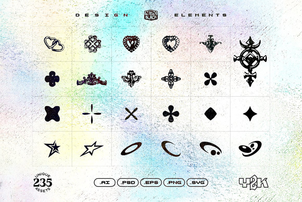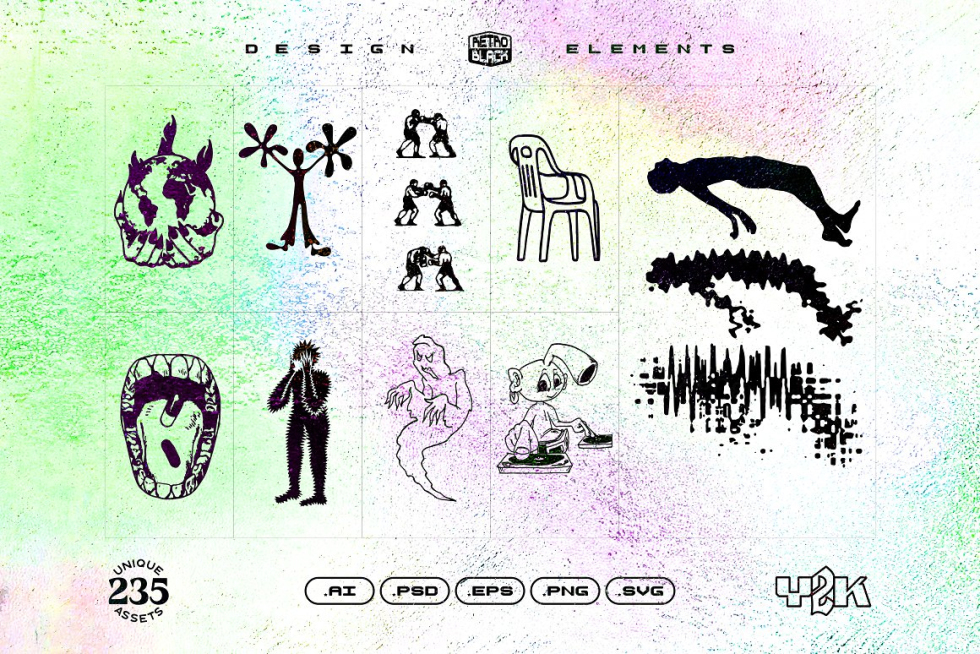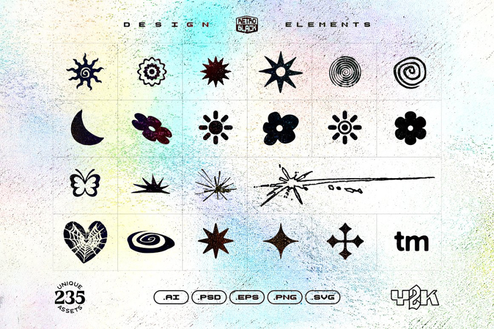 该包的灵感来自 90 年代末至 2000 年代初围绕“千年虫时代”的真正独特且短暂的流行文化。这些向量被专门挑选来创建一个可靠的工具包,同时从类似的现有工具包/包中脱颖而出。有超过 235 种独特的形状、图形资产/元素、字符和短语。所有这些都展示了 90 年代的勇气和新千年的乐观光芒。街头时尚品牌、标志设计、海报、社交媒体图形等的理想选择。