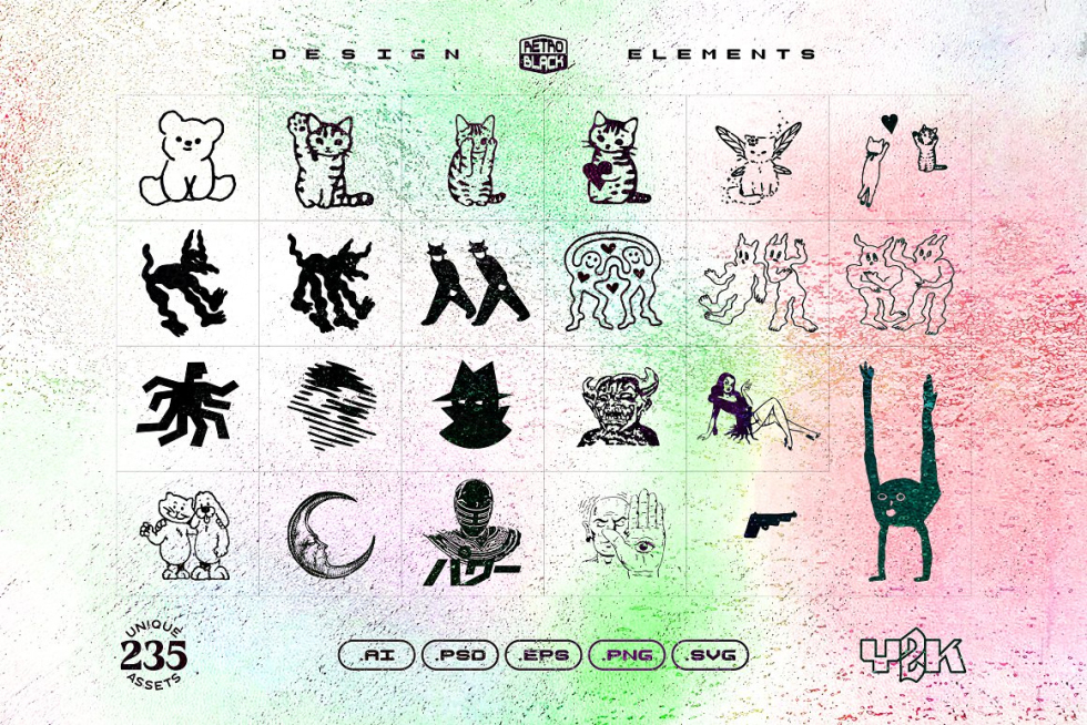 在此包中,您会找到高质量的徽标、抽象图标、形状、资产、字符和短语。所有这些都以矢量格式(.AI 和 .SVG)和光栅格式(.PSD 和 .PNG)提供。