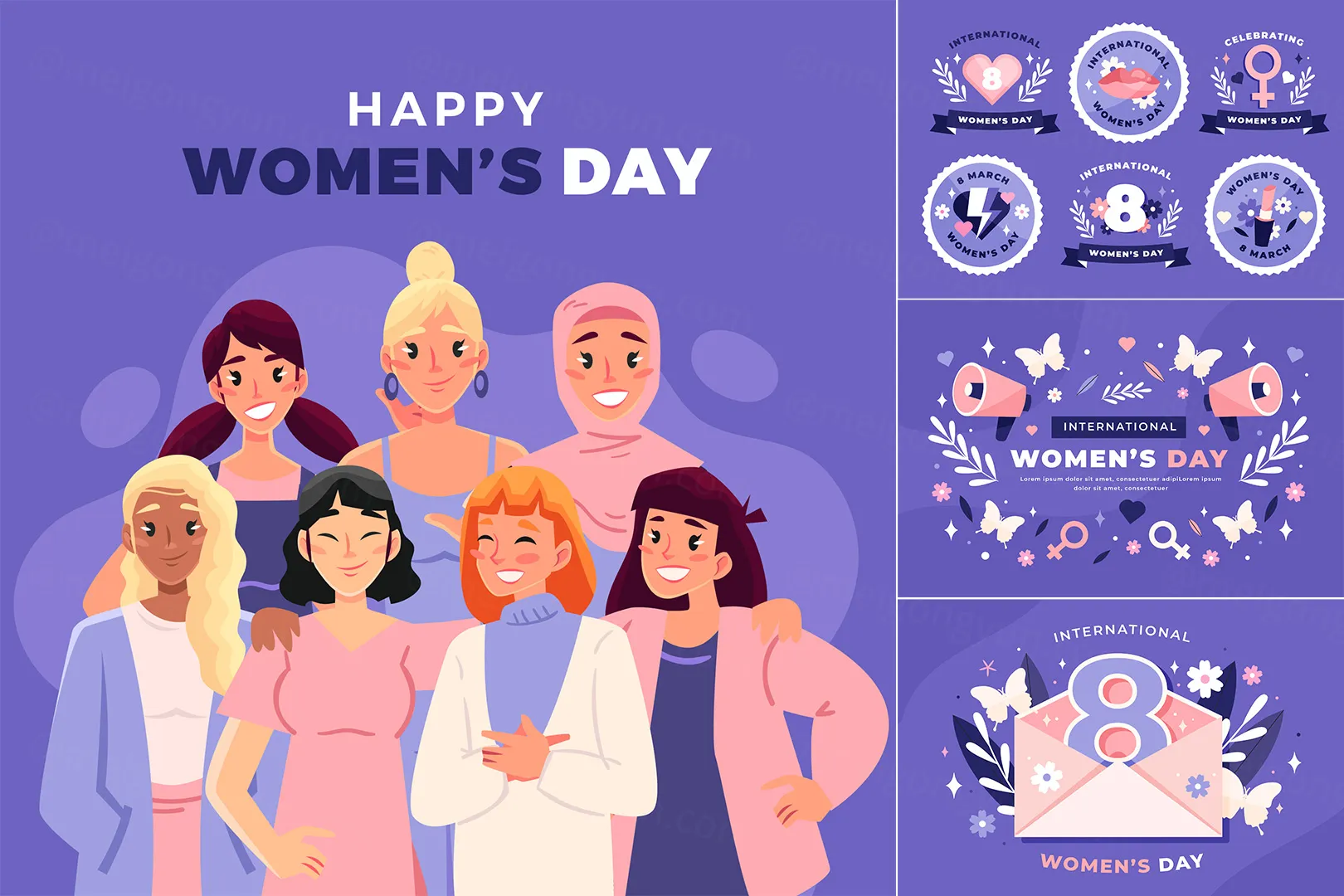 高质量三八妇女节38女神节贴纸徽章横幅宣传单海报EPS矢量创意人物插画素材合辑