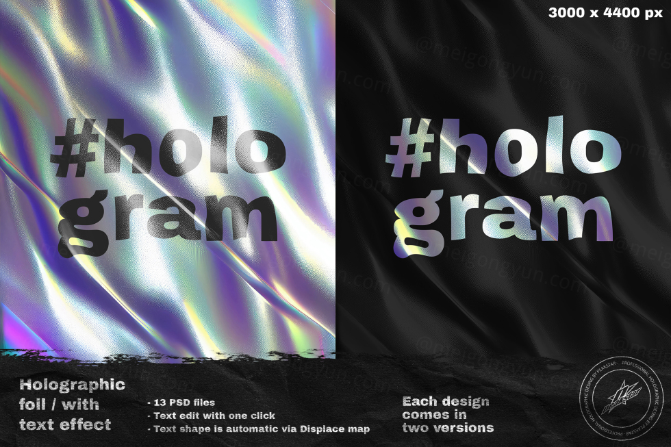 隆重推出带有 Photoshop 文字效果插件的全息箔!用这种风靡全球的令人惊叹的未来主义趋势提升您的设计。借助我们的全息箔制作闪闪发光的醒目图形,为您的品牌增添一丝魔力。非常适合商业用途,此附加组件将使您在竞争中脱颖而出,并使您的设计真正脱颖而出。