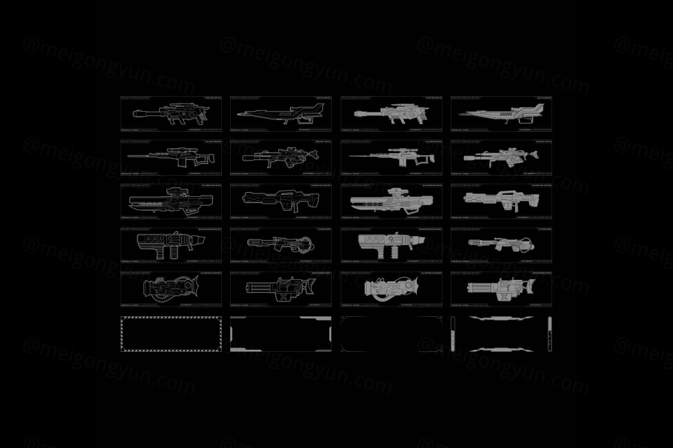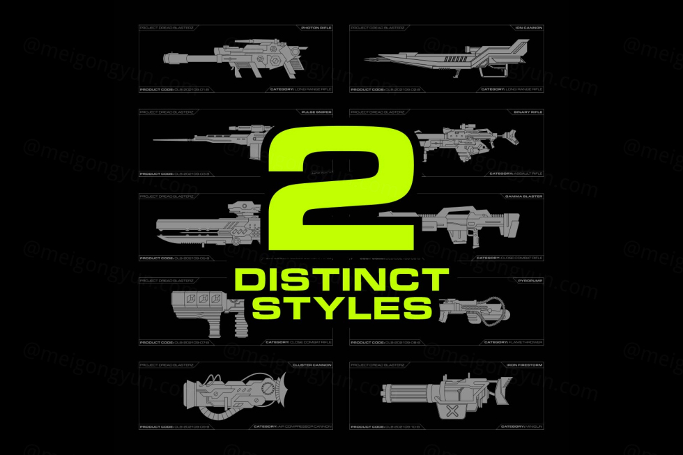 受未来和虚构射击游戏和机甲的启发,DREADLABS 为您带来了 DREAD BLASTERZ:一个包含各种步枪和爆能枪的矢量包。用激光束、霰弹枪和火焰喷射器填充你的艺术作品和海报的网格,营造出工业未来主义的外观。矢量包的灵感来自 BORDERLANDS、CALL OF DUTY 和 GUNDAM 等特许经营权。