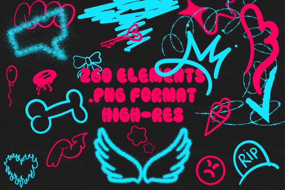 隆重推出包含 260 个独特手绘图形的涂鸦工具包!这个多功能工具包是所有创意项目的必备工具。无论您是制作令人惊叹的海报、迷人的专辑封面、令人惊叹的照片还是时尚的街头服饰设计,涂鸦工具包都能满足您的需求。 包括: 260 .png 透明背景图形 300 分辨率 分辨率取决于图形的大小和形状。介于 6451 x 5575 和 8543 x 5583 像素之间。