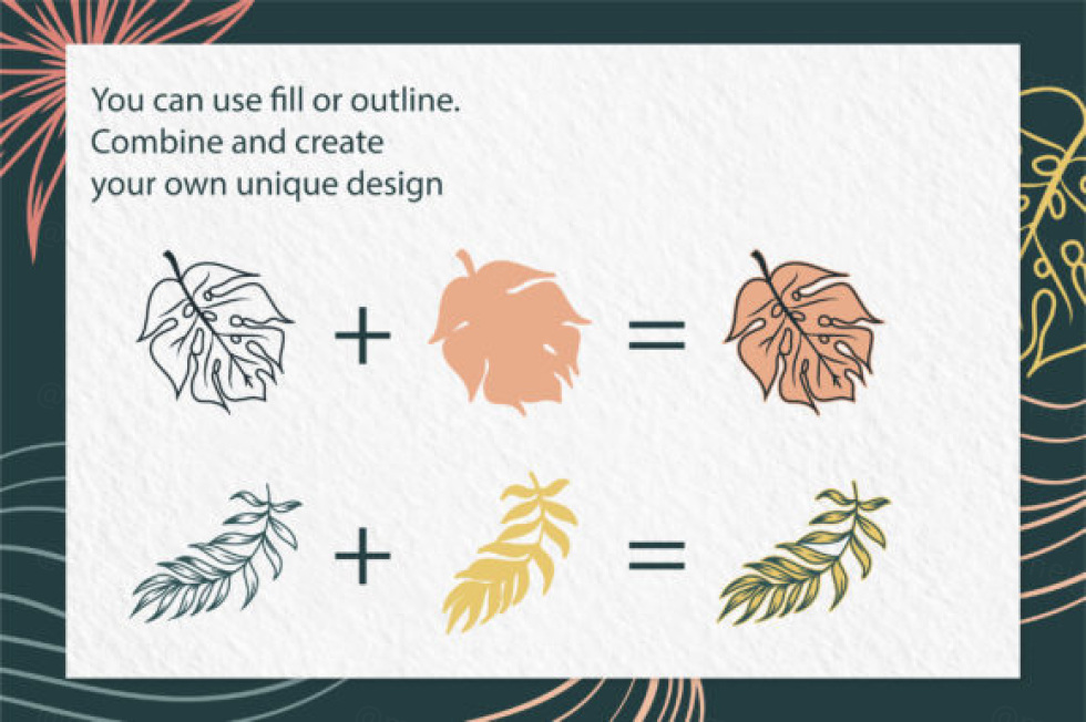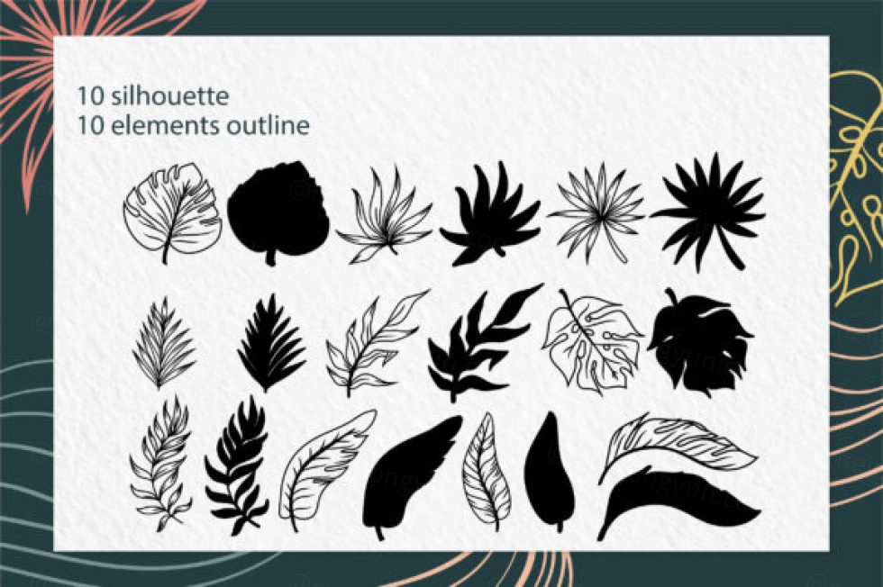 热带树叶夏季植物图形素材,使用此文件,您可以制作:贴花,T恤衫,手提袋,杯子,漱口杯,邀请函设计,剪贴簿,标志制作,装饰品,贴纸等。将此设计用于您的数字项目。下载中包含SVG、DXF、EPS、PNG文件。