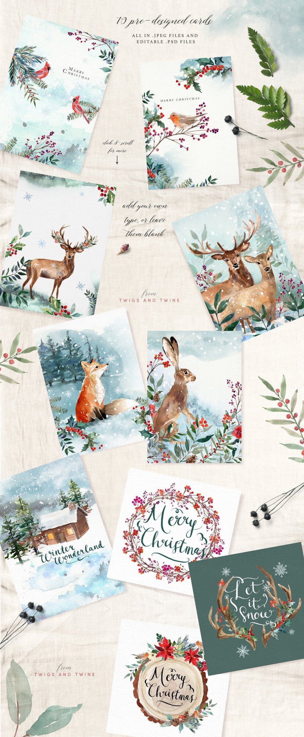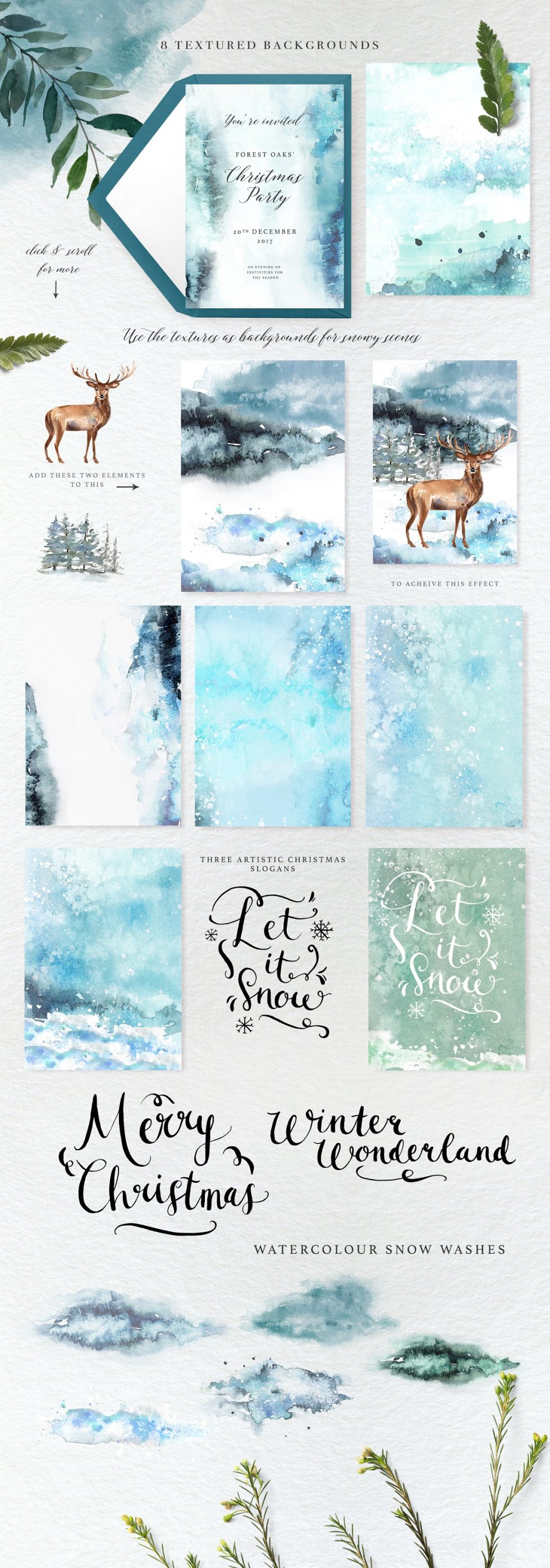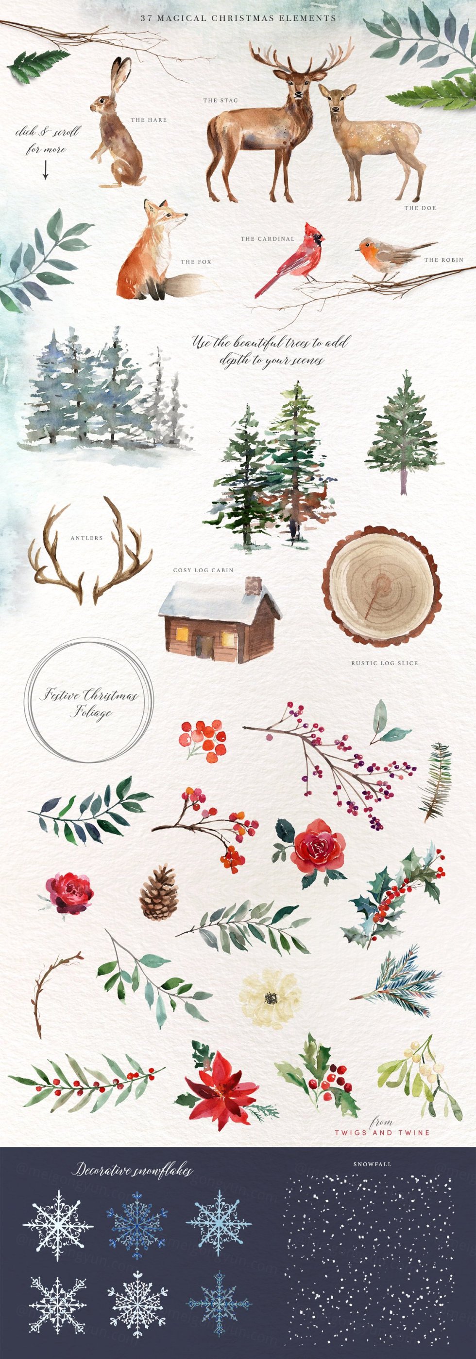 充满水墨的水彩画描绘出寒冷而温暖的林地景象。好奇的动物生活在枞树,树叶和浆果中,营造出神奇的圣诞节背景。每个元素都经过仔细的水彩手绘,然后用于创建许多可用于节日项目的设计。我还创建了一些水彩水彩雪背景,以创建风景并为最小的抽象设计提供背景。
