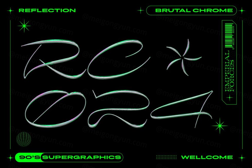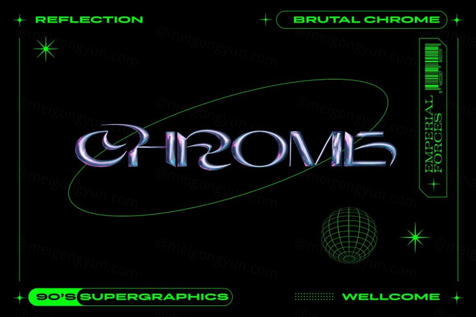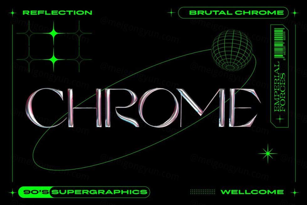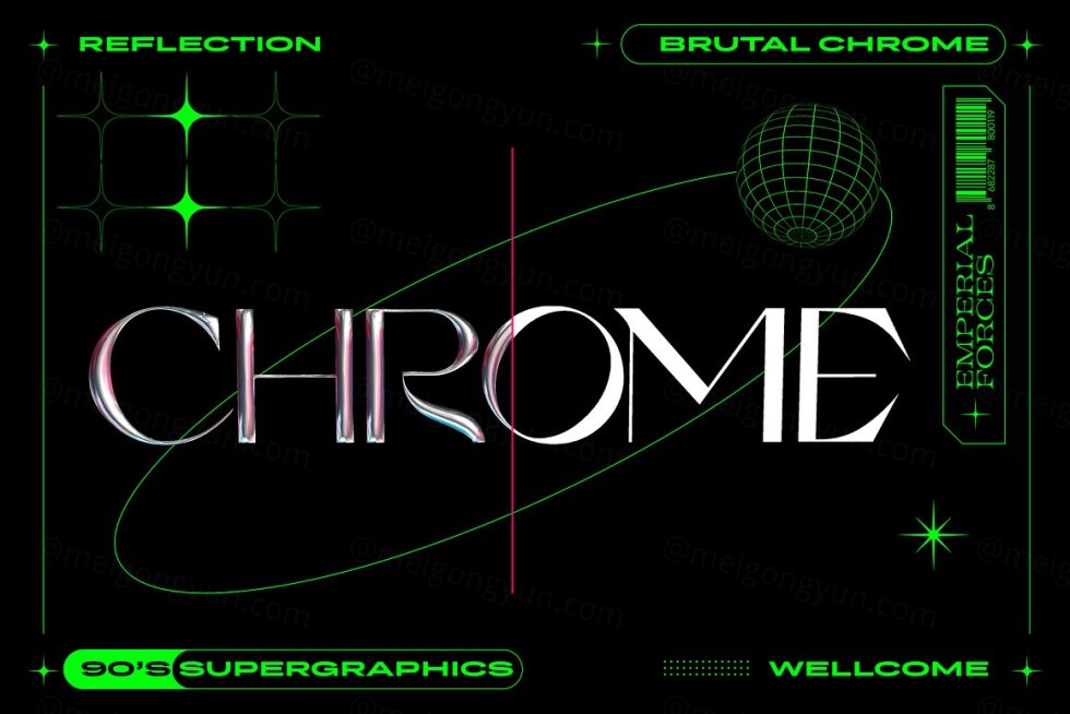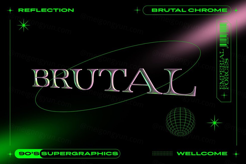 Brutal Chrome 文字效果是一种复古未来主义的文字效果,非常符合新时代的设计趋势。使用 4 种不同风格的反射,您可以创建令人惊叹的复古未来主义设计。PSD文件中还包含图形元素。 文件为 4500x300 300 dpi 享受!