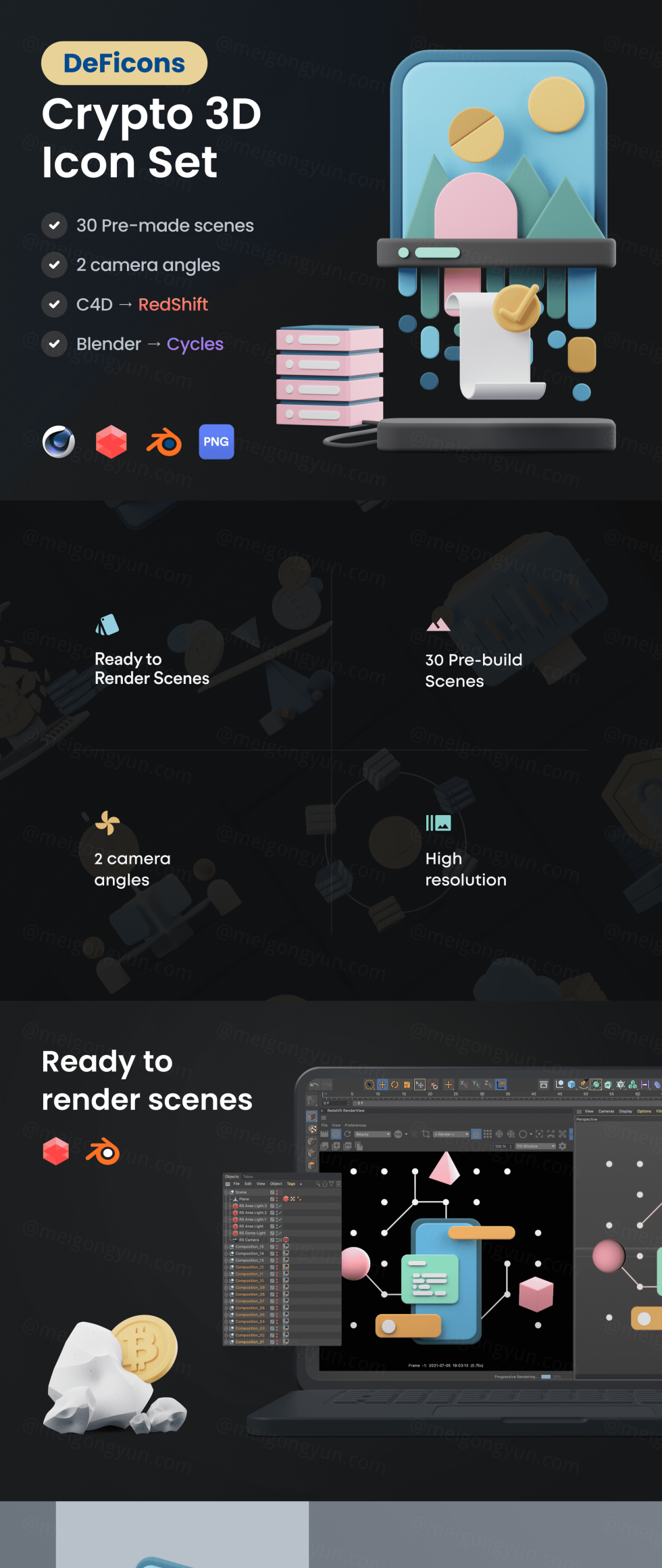 为您的下一个项目设置的漂亮的加密 3D 图标 向 DeFicons 打个招呼 - 3D Icon 一组美观的加密场景,可完全自定义并准备在 C4D(使用 RedShift)或 Blender(Cycles)中渲染。 从具有 2 个摄像机角度(前视图和等距视图)的 15 个不同场景中进行选择,或者混合搭配不同的对象,在您最喜欢的 3D 程序中创建自己的场景。 结合不同的元素来创建引人注目的作品,帮助您在短短几分钟内为着陆页、网站、演示文稿等讲述更好的故事。