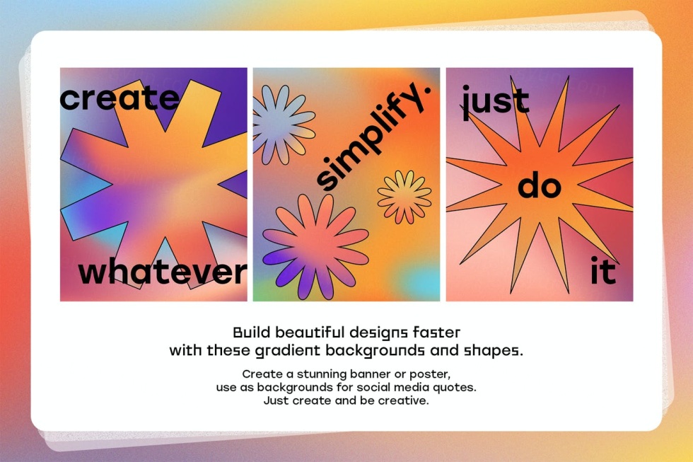 适用于 Adobe Illustrator 和 Adobe Photoshop 的 10 个生动可调渐变的集合,有 3 种尺寸:风景、Instagram 帖子、Instagram 故事。 作为渐变纹理的重要补充,pack 包含 10 个流体渐变形状和 36 个几何形状,可在 Illustrator 和 Photoshop 中进行编辑。使用这些制作精美的图形元素更快地为您的品牌、产品、网站、社交媒体以及更快地设计和构建一些东西。