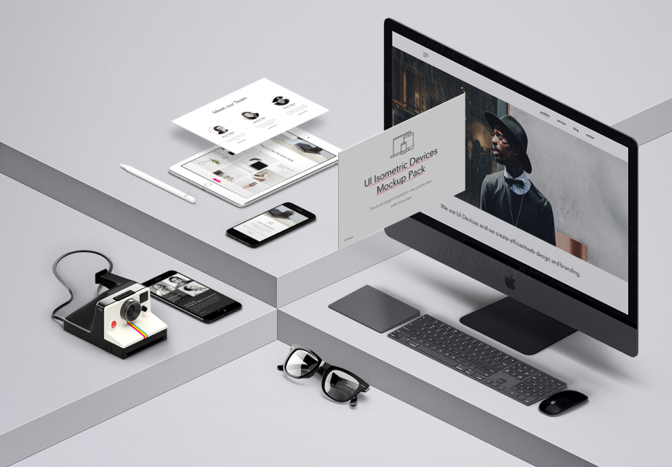 高分辨率等距设备和UI元素与psd iMac Pro,psd iPad和iPhone模型。借助智能图层轻松添加自己的图形。了解我们的其他卷以创建更多场景。