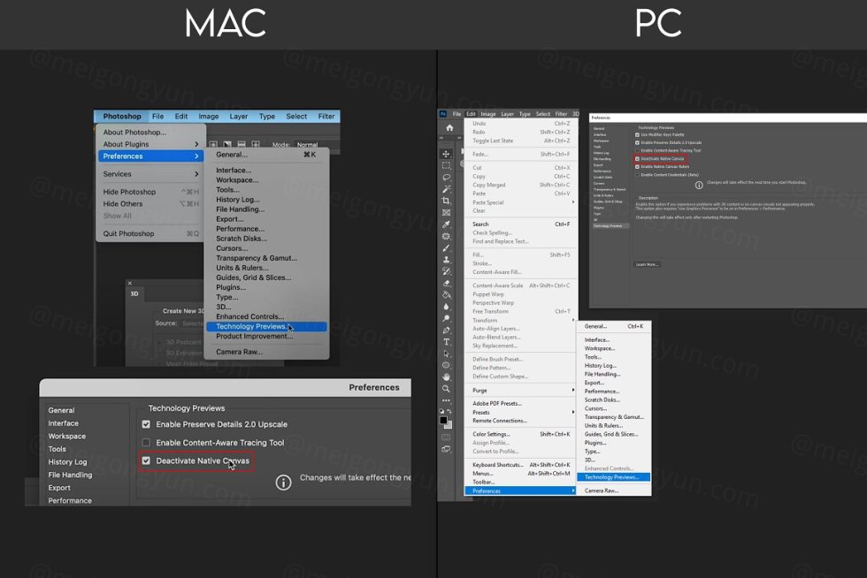 Preferences Technology Previews,并选中 Deactivate Native Canvas 项,然后重新启动 Photoshop。