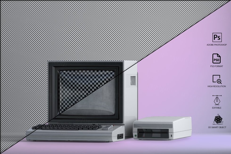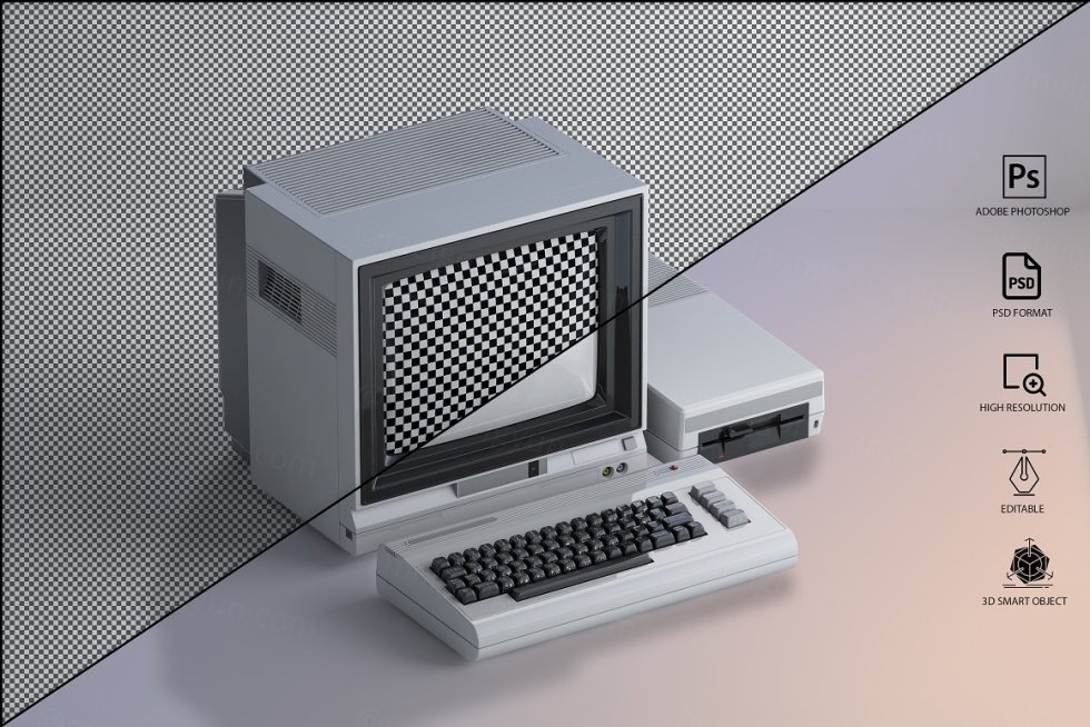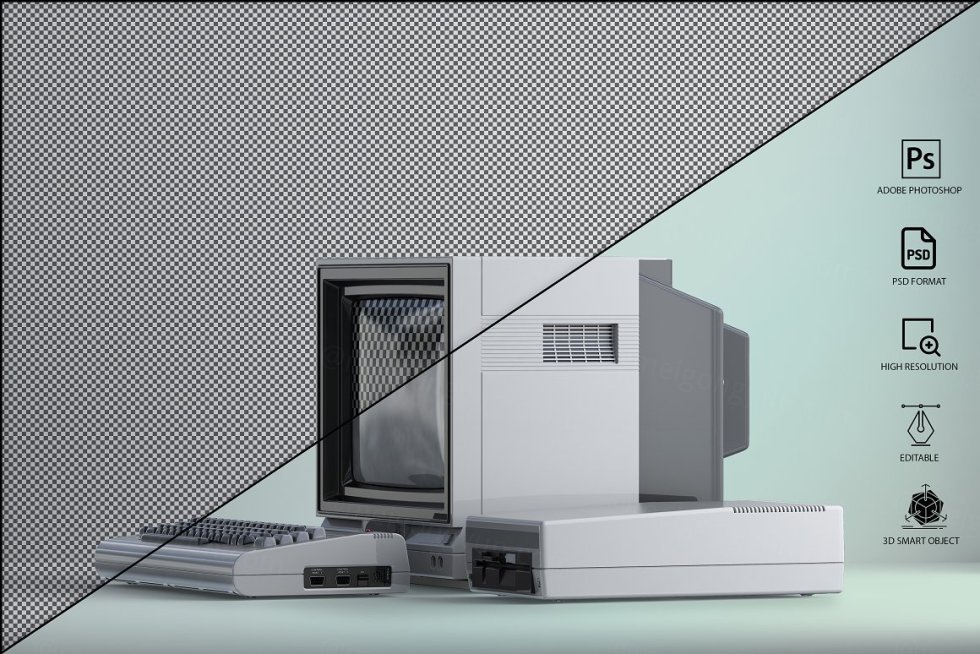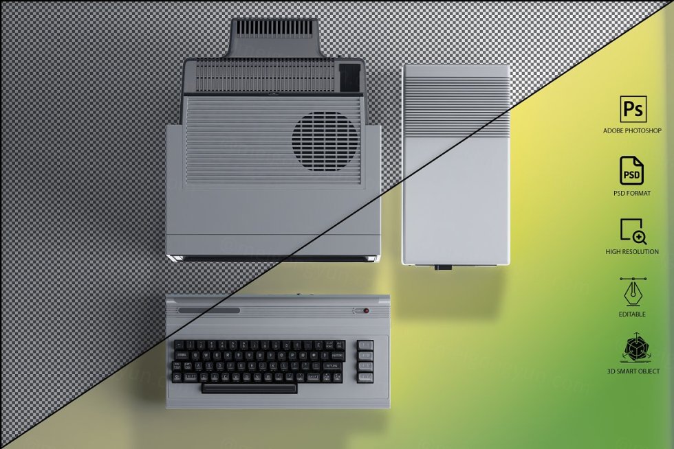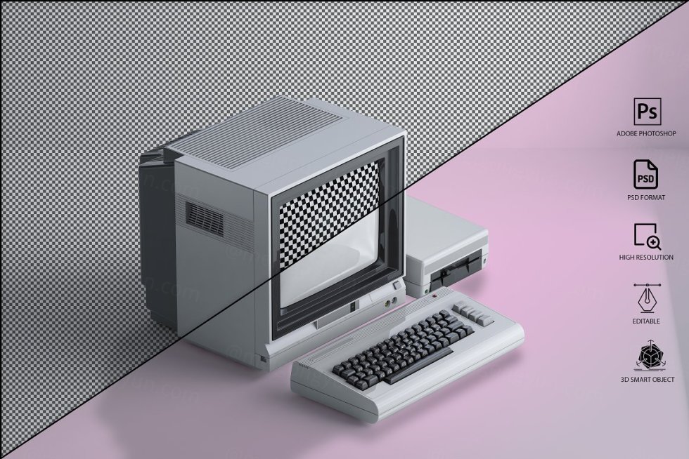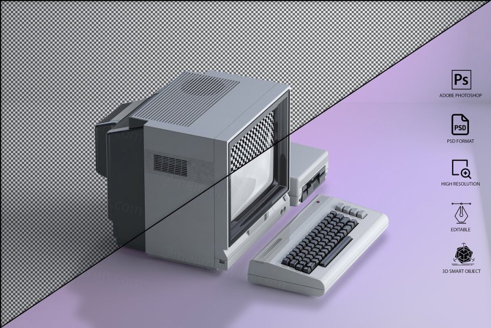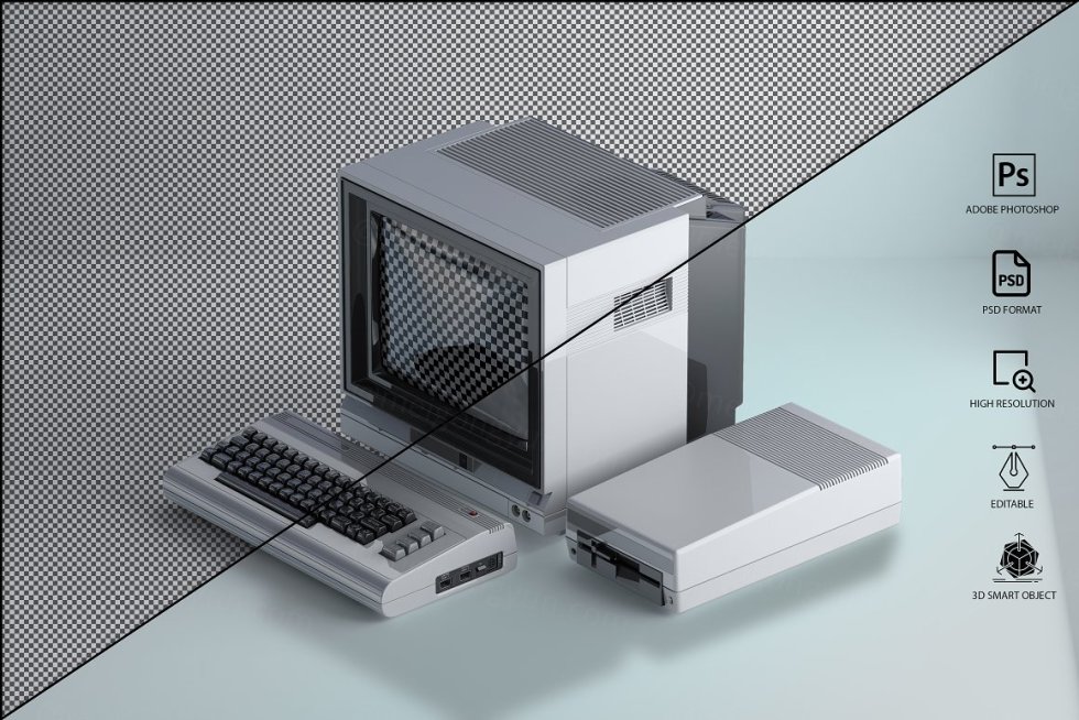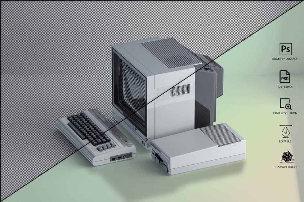 三维渲染复古老物件旧电脑CRT显示器展示样机PSD模板 Commodore 64 Old pc Mockup