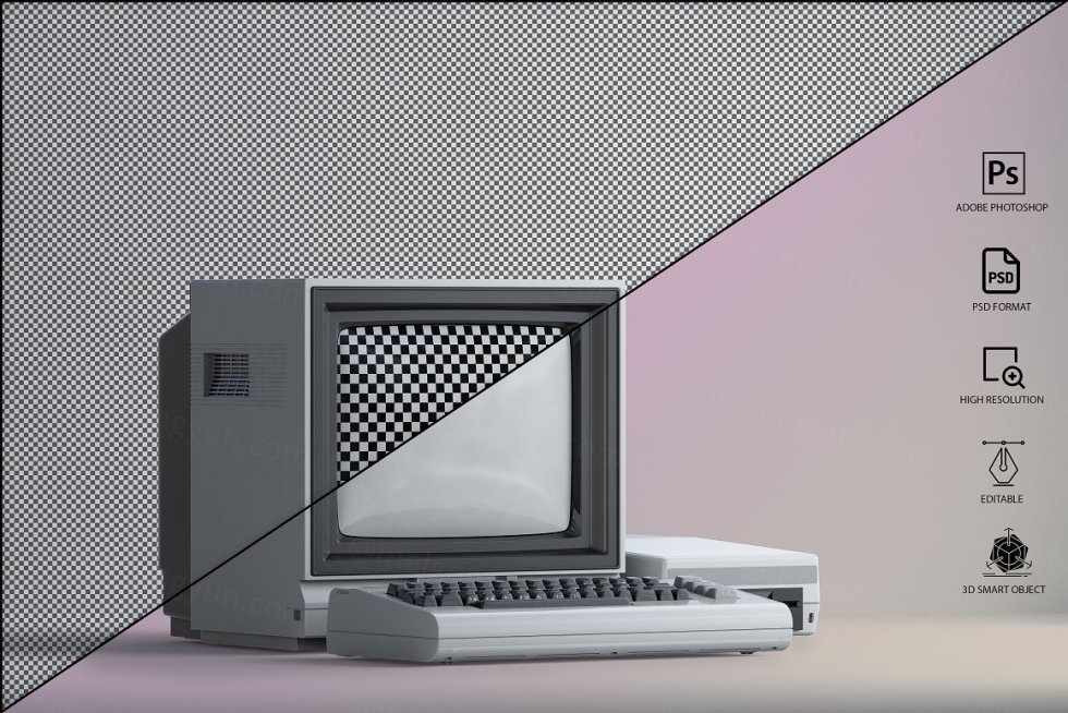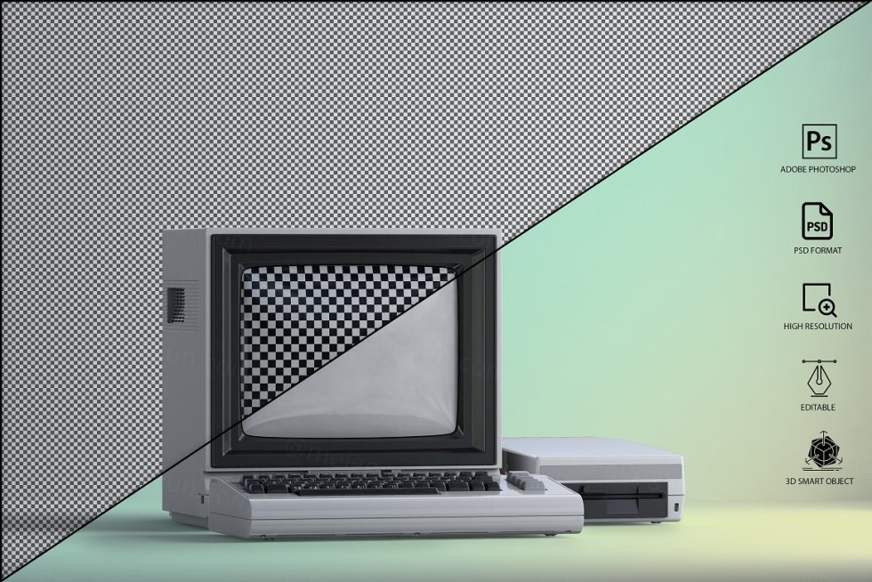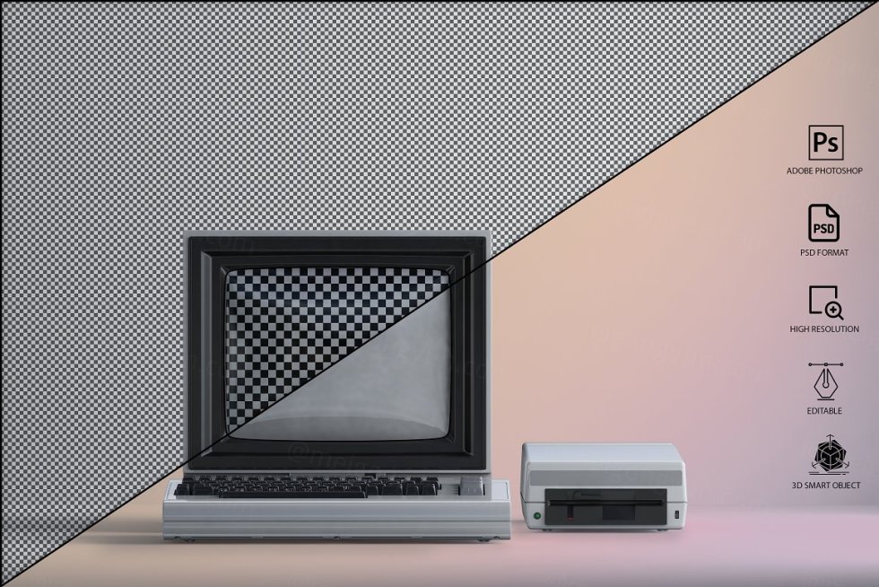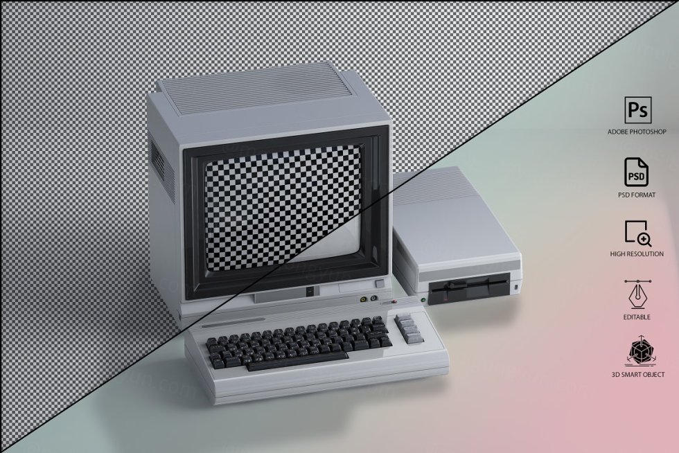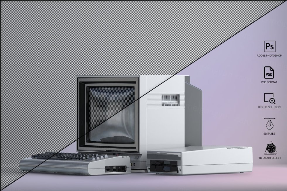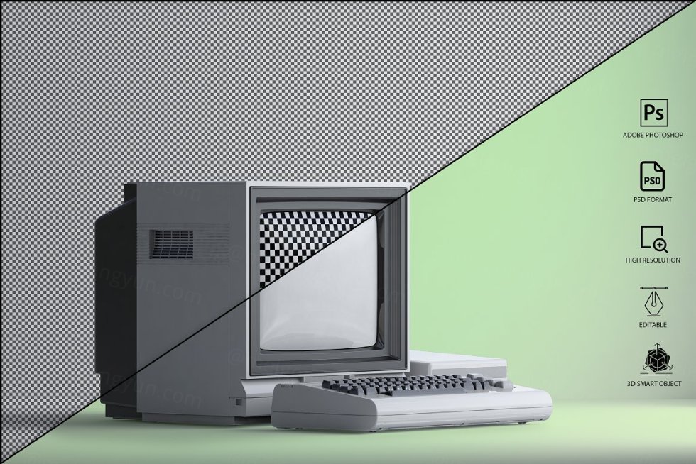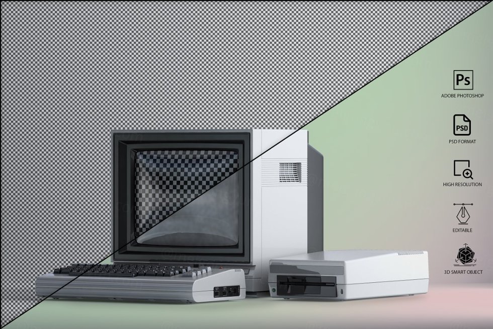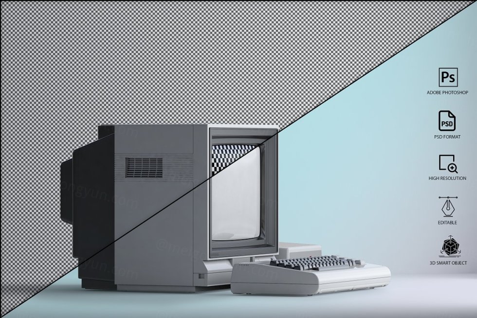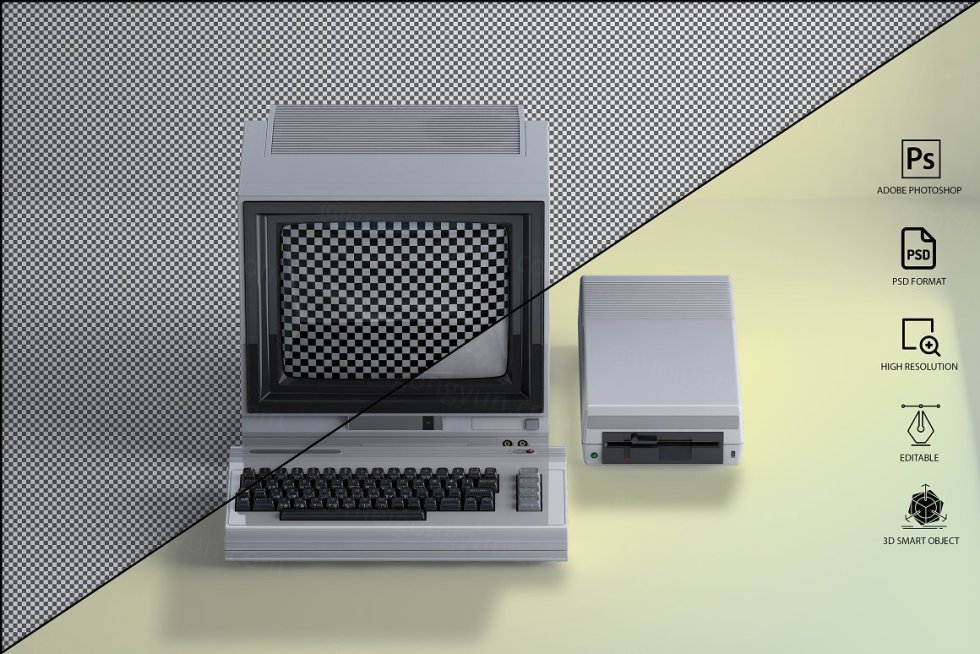 三维渲染复古老物件旧电脑CRT显示器展示样机PSD模板 Commodore 64 Old pc Mockup