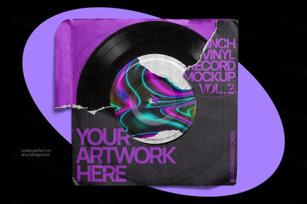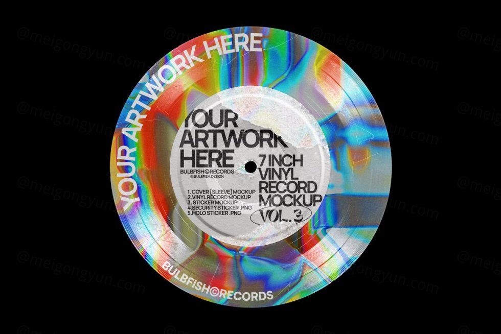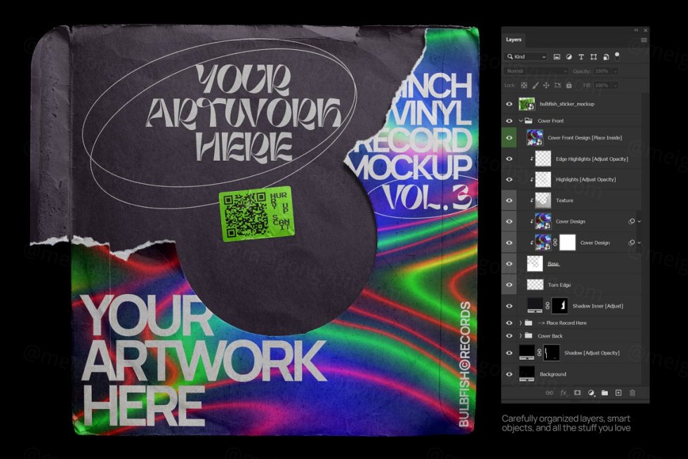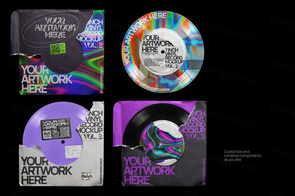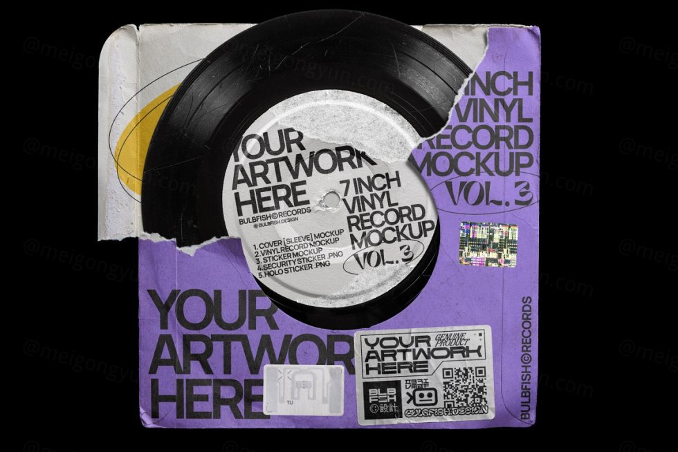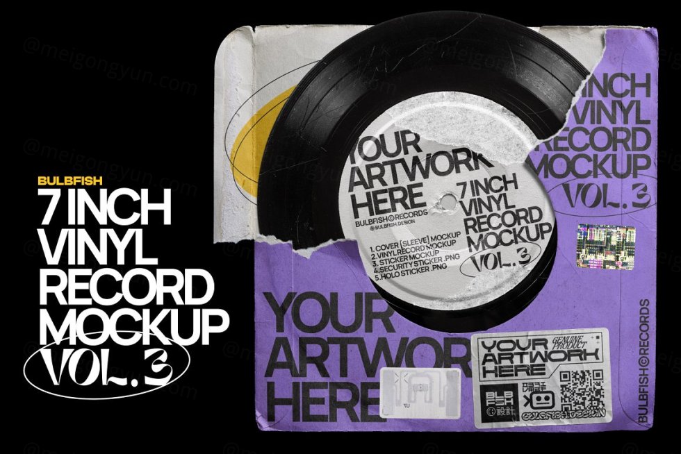7 英寸乙烯基系列的第三个项目。这是一个完全可定制的黑胶唱片场景创建器。划伤的乙烯基、撕裂的标签、撕裂的封面 - 所有这些都将为您的艺术品、封面设计等增添真实和复古的感觉。包装包括 5 个元素:7 英寸黑胶唱片、唱片封面、贴纸、安全贴纸、全息贴纸。根据需要自定义和组合元素,以创建自己独特的场景。顺便说一句,包中已经包含一个预制场景。