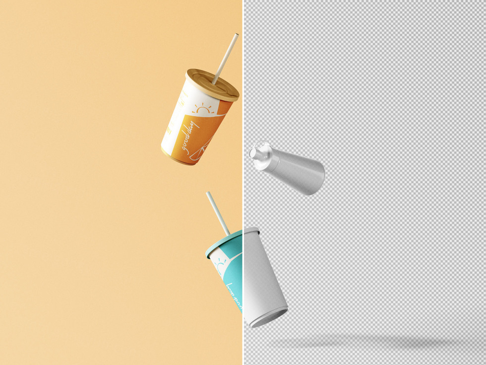 杯子、吸管和酱汁瓶等餐厅用品的品牌模型。使用 Photoshop 经典和智能图层易于操作。适合作为客户餐厅包装和品牌形象化的一部分。