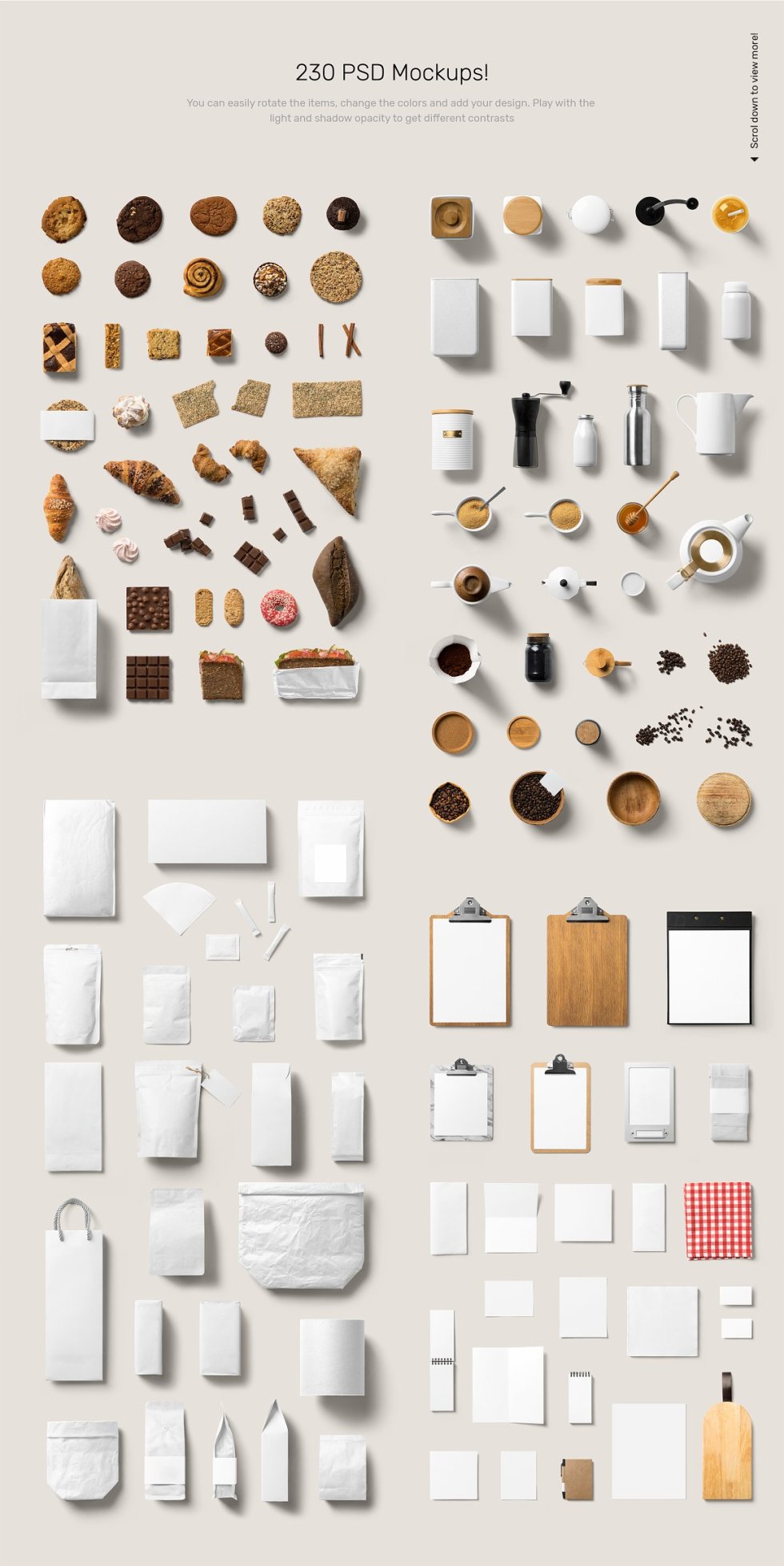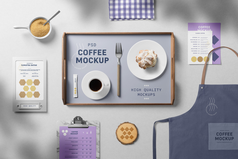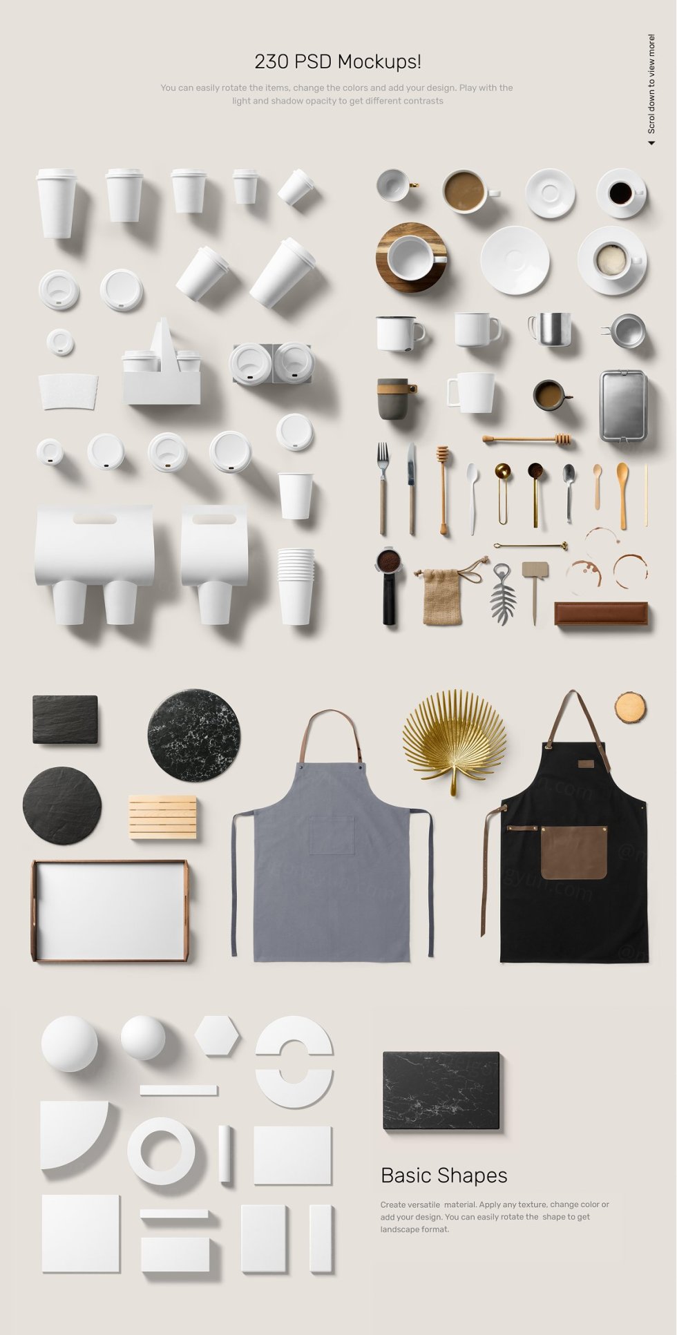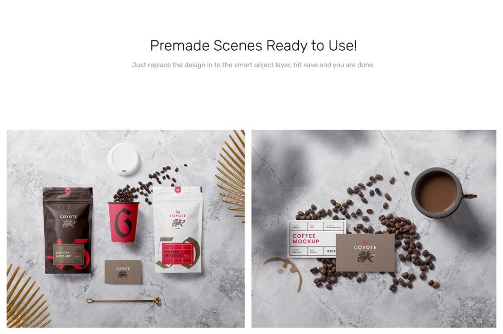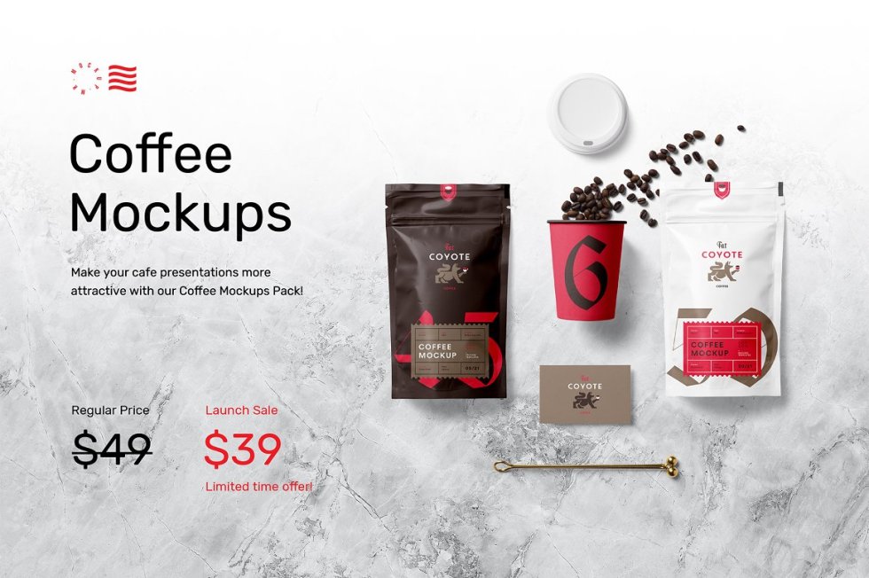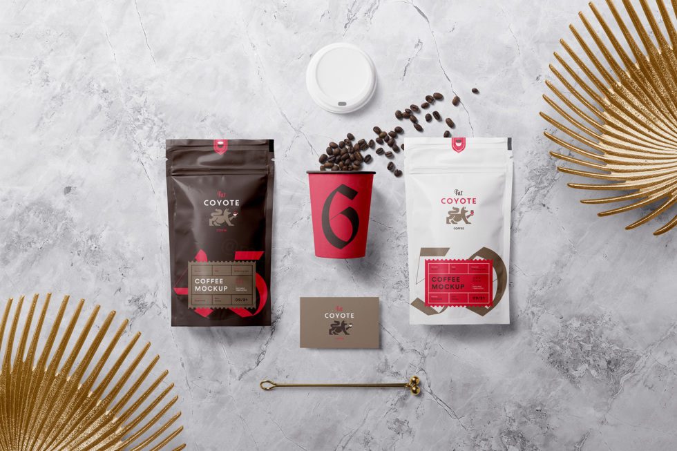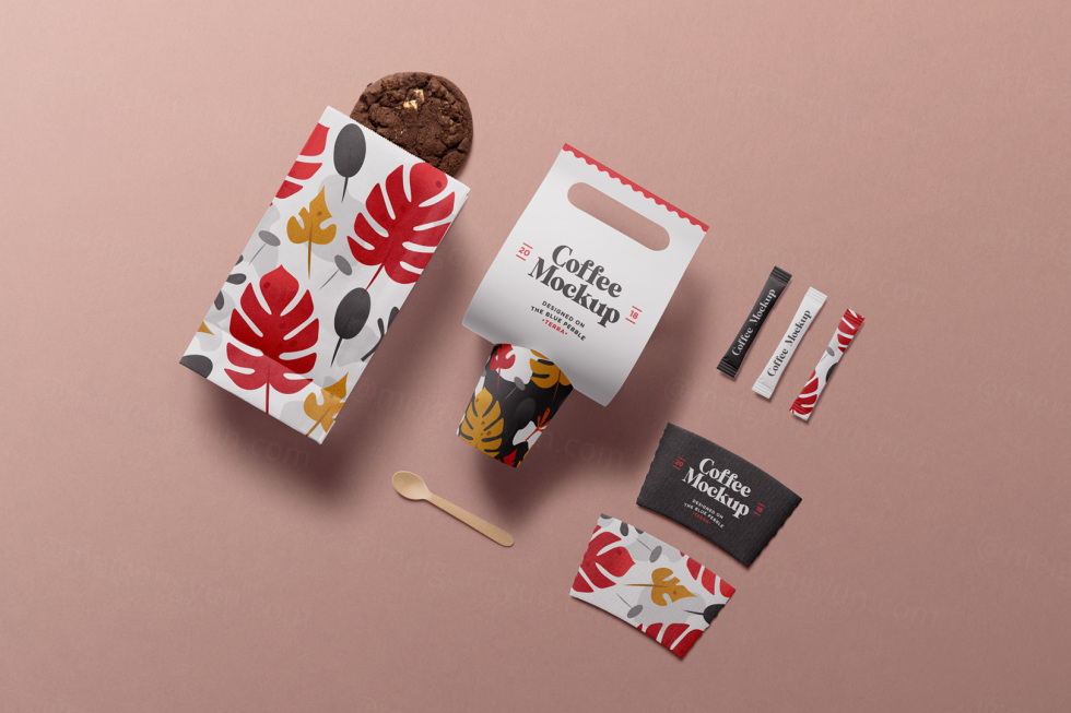 使用我们的 Coffee Mockups Pack 让您的咖啡店品牌展示更具吸引力!所有物体和阴影都完全分离,因此您可以轻松玩转它们并创建自己的场景。旋转项目,更改颜色并添加您的设计。调整光影不透明度以获得不同的对比度。只需将设计替换到智能对象层,点击保存,即可完成。你一定会爱上它!