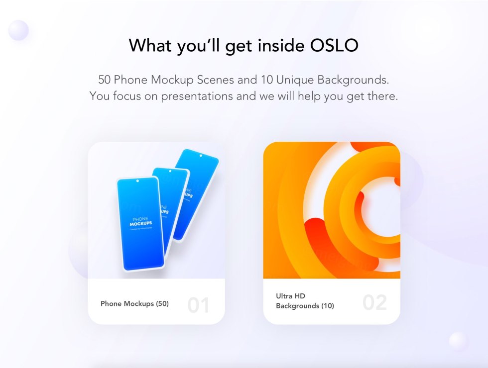 Oslo-Phone Mockups Pack 可加速设计展示过程并为您的演示添加另一个维度。这个包专注于简单,它包括 50 个精心制作的 4K 分辨率动画移动模型。在 dribbble 或 Behance 上动态展示您的设计,并为您的演示增添额外的优势。使用 OSLO 为您的应用创建营销活动。