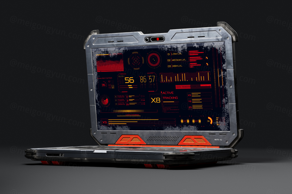 未来派赛博朋克末日科幻场景UI界面设计展示笔记本电脑样机模板 Cyber Laptop Mockups