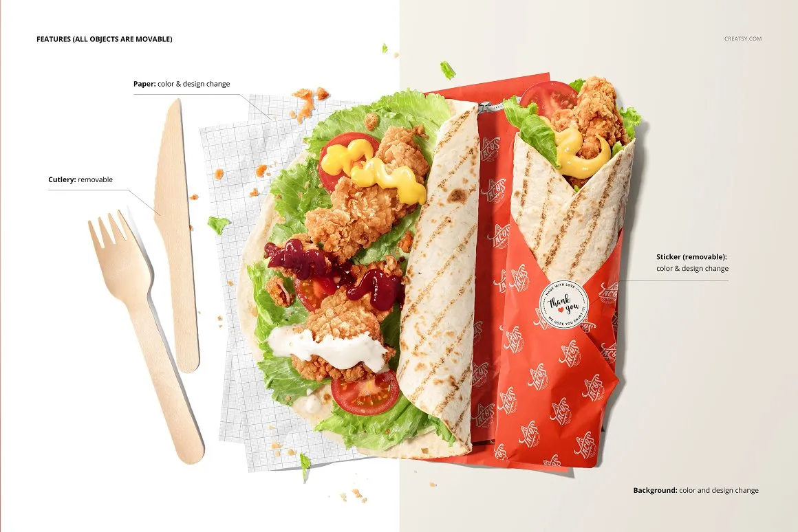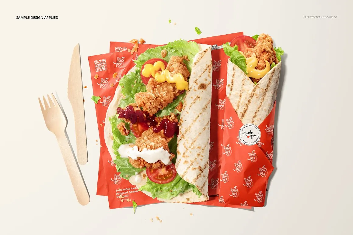 餐厅鸡肉卷食品安全卫生包装纸品牌设计展示样机模板 Tortilla Food Safe Paper Mockup