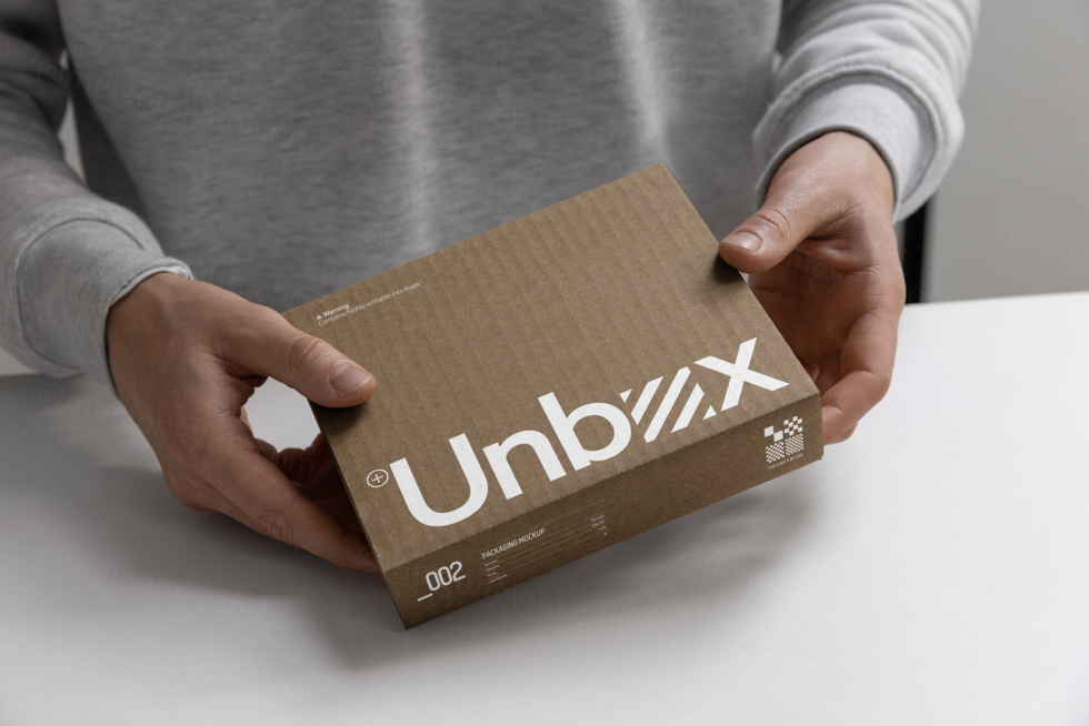 高质量拆箱场景特写镜头瓦楞纸快递纸箱品牌包装设计贴图展示样机模板 Unboxing Mockup