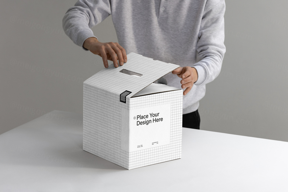 高质量拆箱场景特写镜头瓦楞纸快递纸箱品牌包装设计贴图展示样机模板 Unboxing Mockup