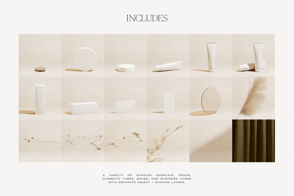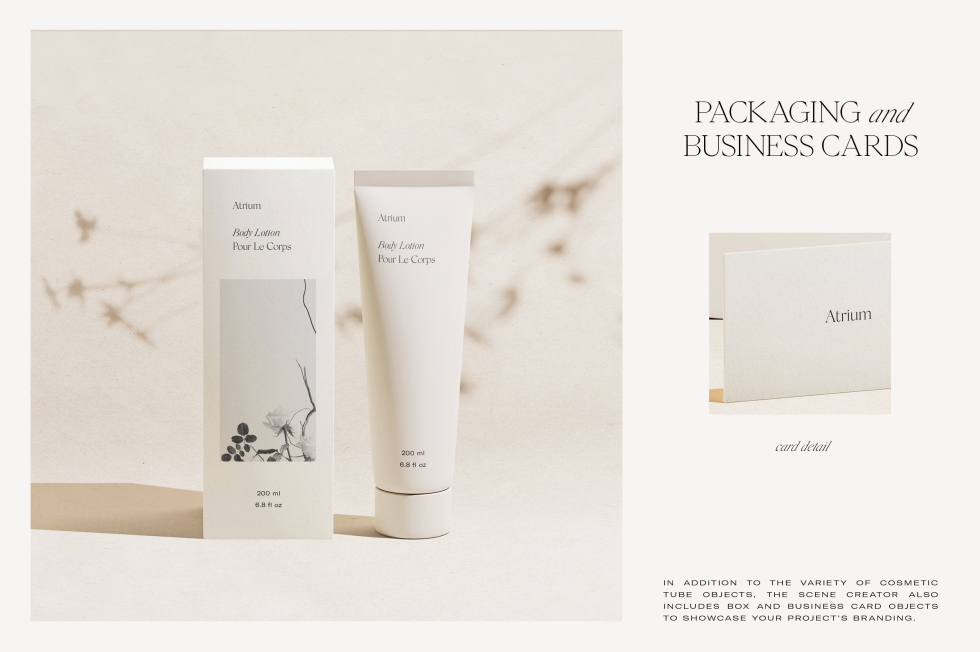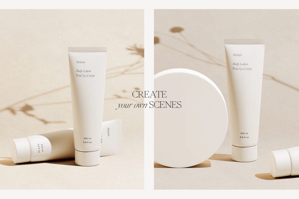 使用我们模型系列的最新成员——中庭场景创建器来展示您的化妆品品牌设计!精心设计和组织的 PSD 文件附带各种对象、道具和阴影叠加层,您可以对它们进行排列、调整大小和自定义,以设计您自己的模型 - 或者只需将您的品牌设计拖放到 12 个预置模型之一中。制作的场景。