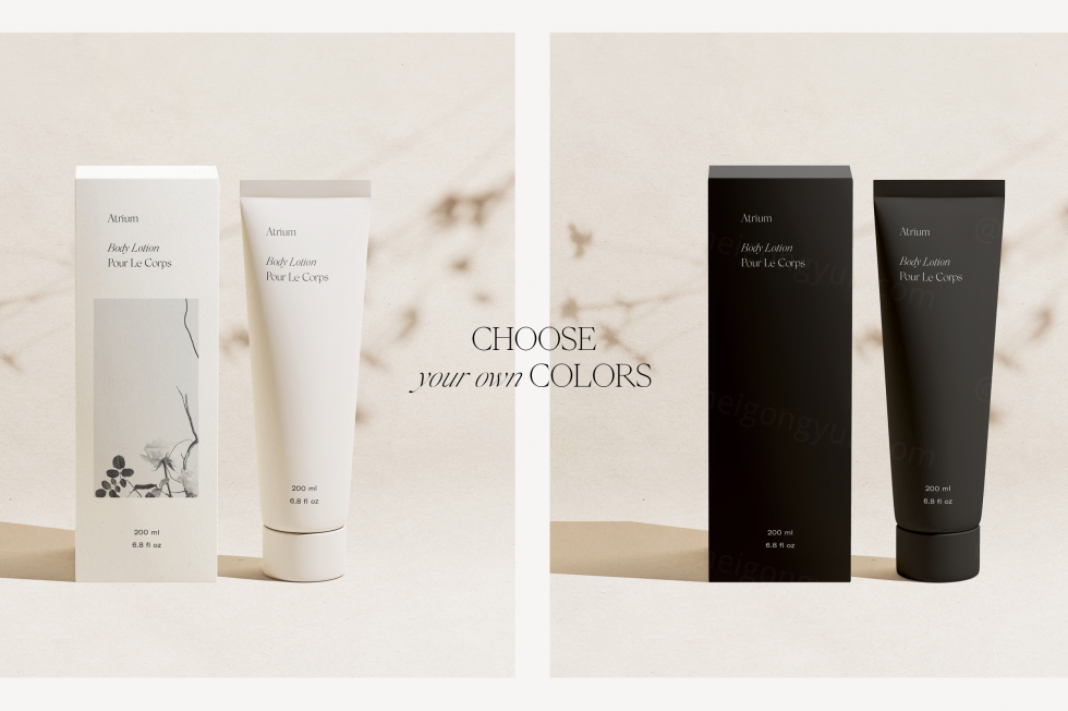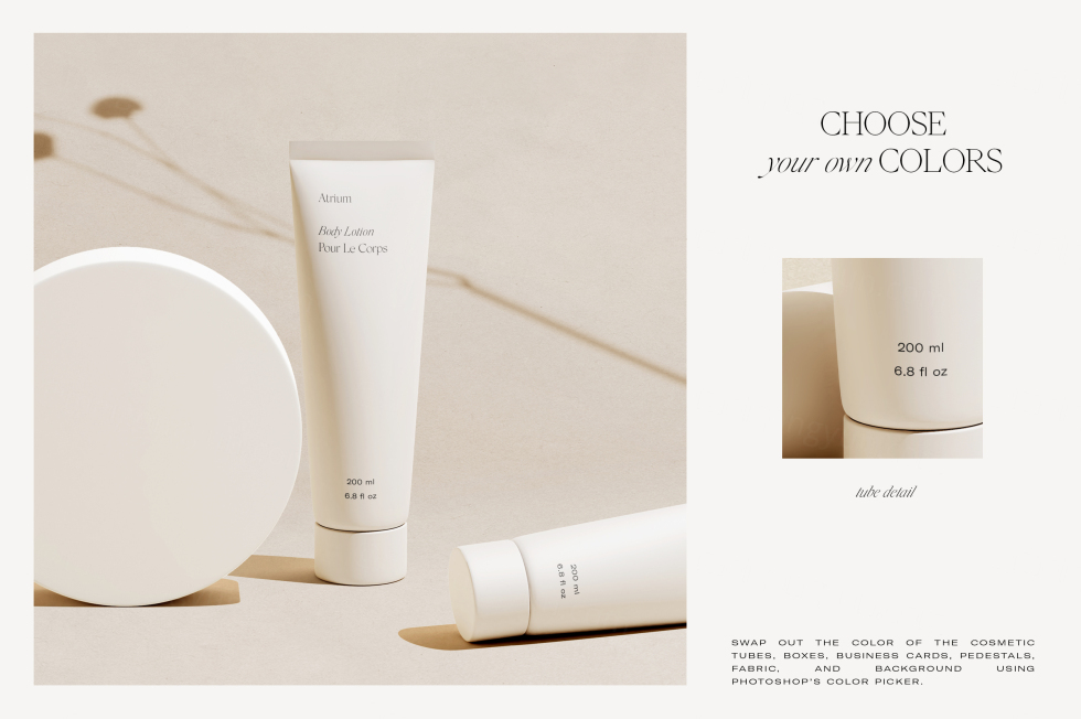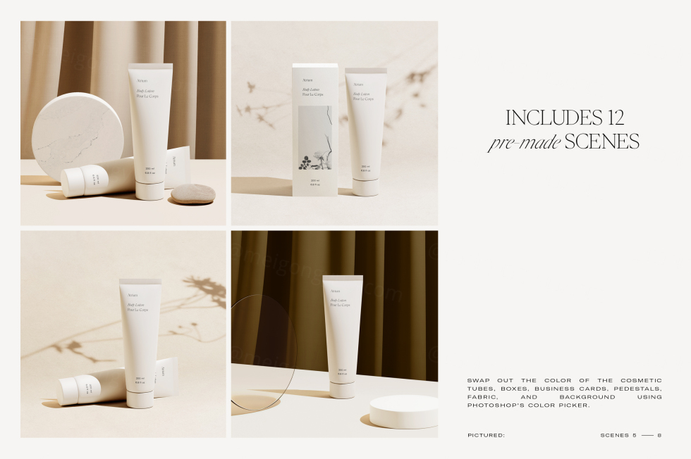 场景创建器包括各种自定义选项,为创建您自己的独特模型提供了无限的可能性。使用智能对象图层轻松插入化妆品管、盒子和名片设计,并使用 Photoshop 的颜色选择器选择您自己的背景、织物、底座和包装颜色。
