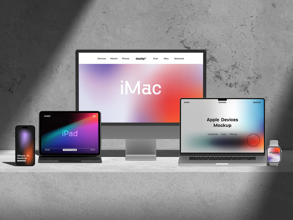 高质量CG建模工业冷淡风苹果全家桶场景展示UI贴图样机模板素材 Apple Devices Mockups
