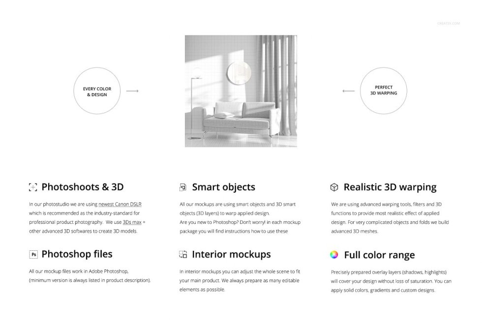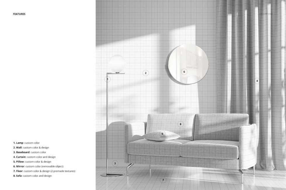 内部场景模板-分层的可编辑.psd文件,通过编辑智能对象和颜色层,准备展示您的自定义设计。