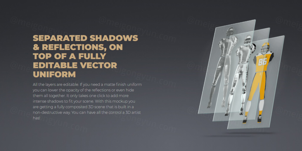 所有图层都是可编辑的。如果您需要哑光饰面制服,您可以降低反射的不透明度,甚至将它们隐藏在一起。只需单击一下即可添加更强烈的阴影以适应您的场景。使用此模型,您将获得以非破坏性方式构建的完全合成的 3D 场景。您可以拥有 3D 艺术家拥有的所有控制权!