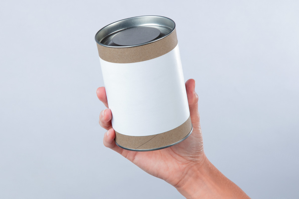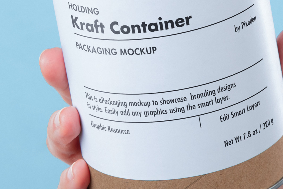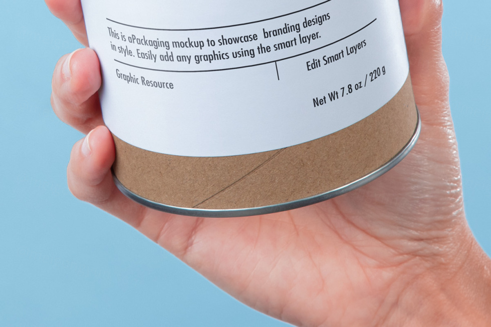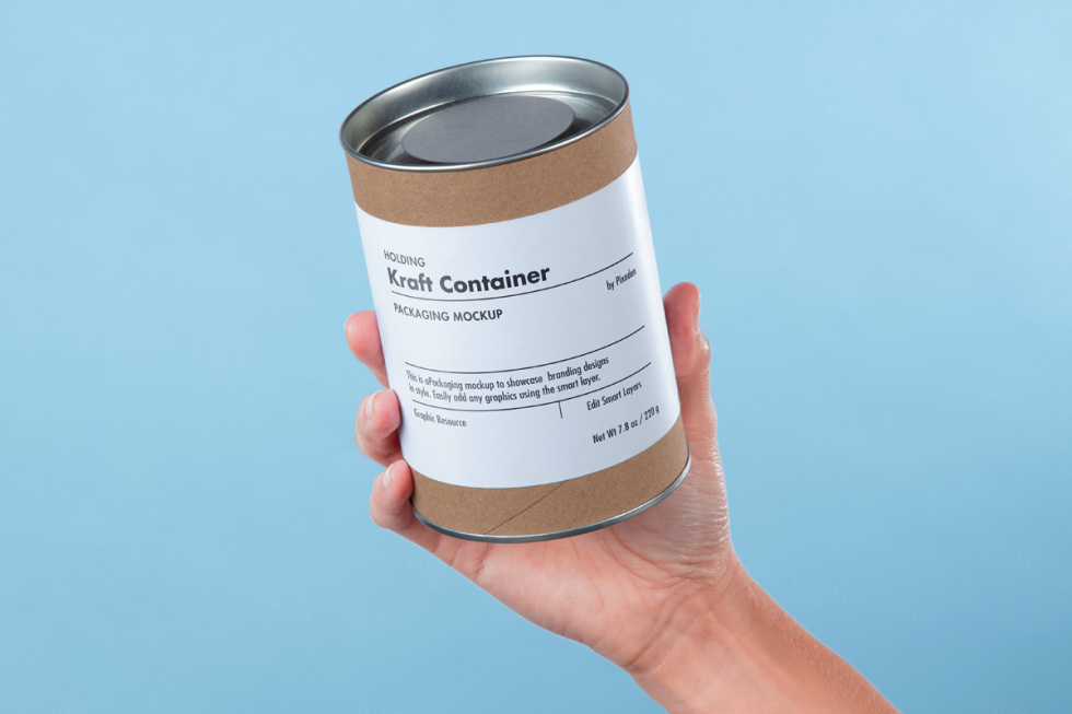 手持牛皮纸圆筒茶叶罐包装设计样机PSD模板 Hand Holding Psd Container Kraft Box