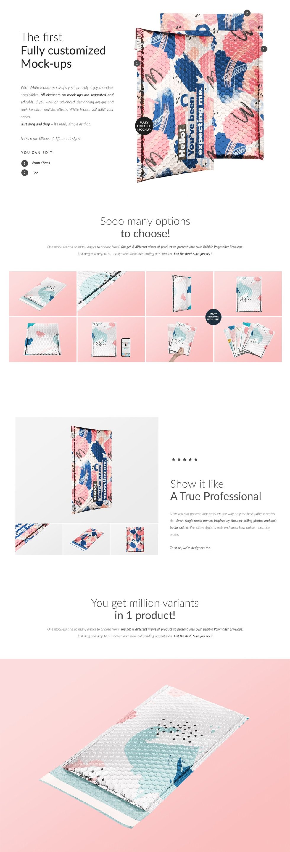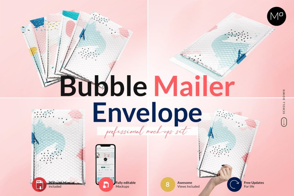 一个模型和这么多角度可供选择!您可以获得 6 种不同的产品视图来创建您自己的 Bubble Mailer 信封套装。拖放以放置设计并进行出色的演示。就这样?当然,试试吧。