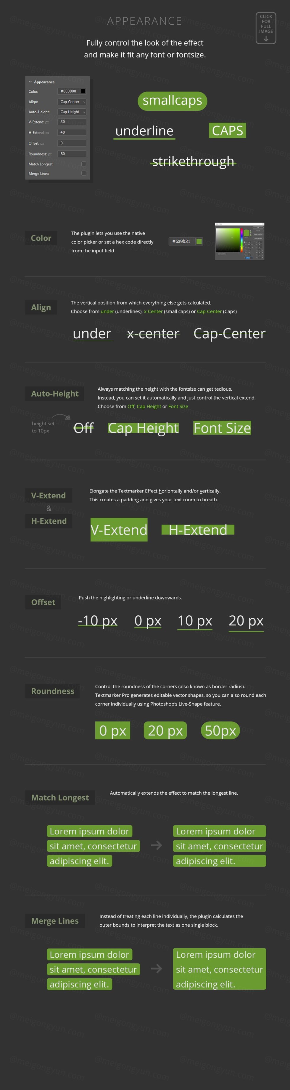 Textmarker Pro 可以轻松地在 Photoshop 中创建文本突出显示和下划线。然而,这还不是全部 - 该插件提供了各种变换和置换,可以改变基本形状并为您提供有用和创造性的结果。当所有这些更新实时发生时,您可以调整所有不同的设置以获得您想要的外观,以便您可以立即看到您所做的更改。