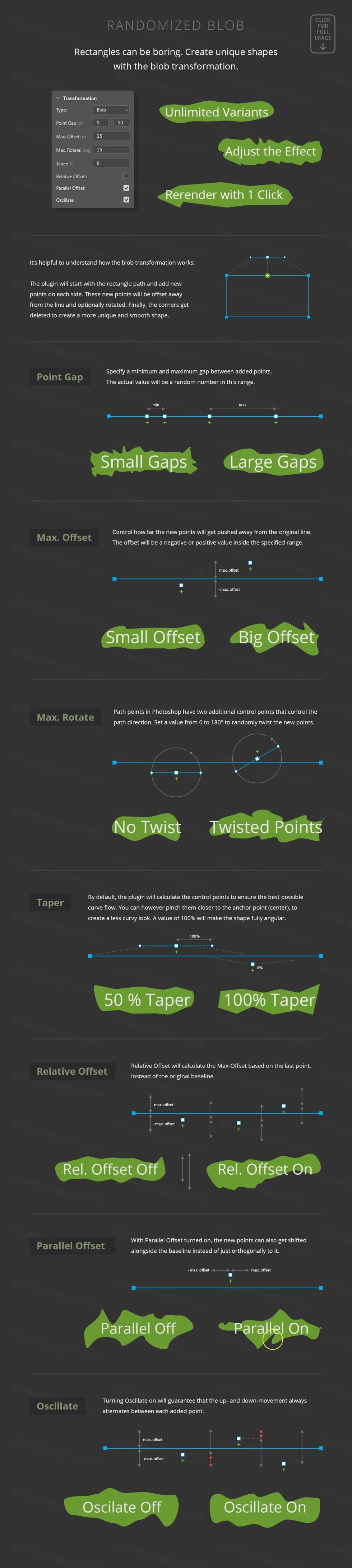 包含的 blob 转换是一个强大的工具,可以根据您可以完全控制的各种参数生成随机形状。除此之外,您还可以创建泡泡、虚线效果、丝带或倾斜的盒子。