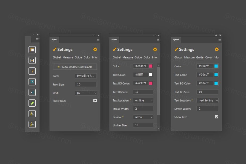 Specs 可以轻松生成测量值(尺寸、距离)、指南和颜色样本。一切的外观都是可定制的,大多数设置都是实时更新的。您可以使用不同的单位进行测量,例如像素、英寸、毫米和厘米,或将颜色显示为十六进制代码、RGB、CYMK 或 HSB。由于字体大小和所有其他视觉样式都是可调的,您甚至可以将 Specs 用于大型打印模板,而不仅仅是用于 Web 的设计。