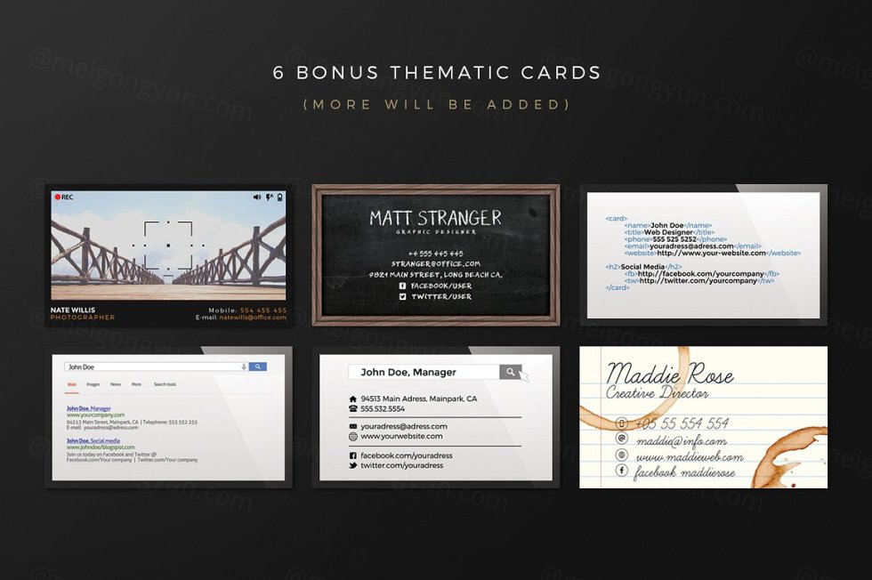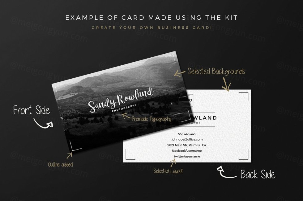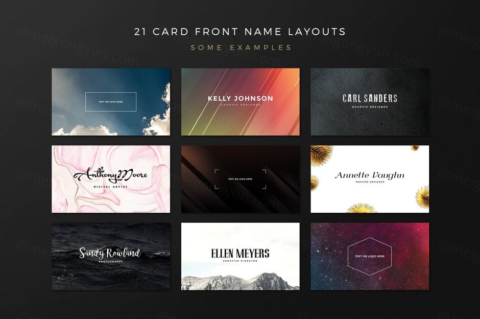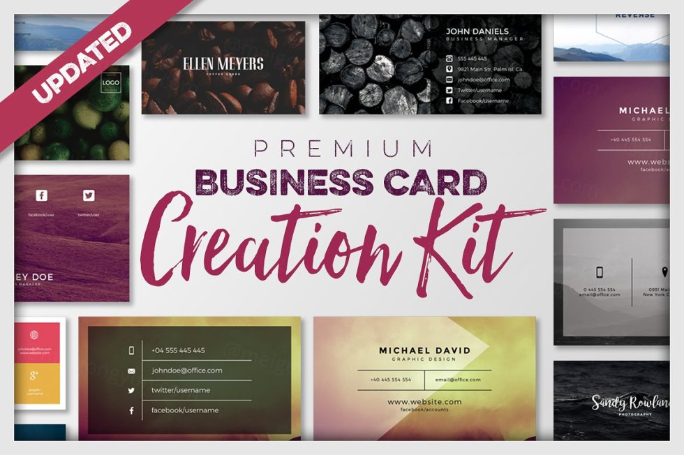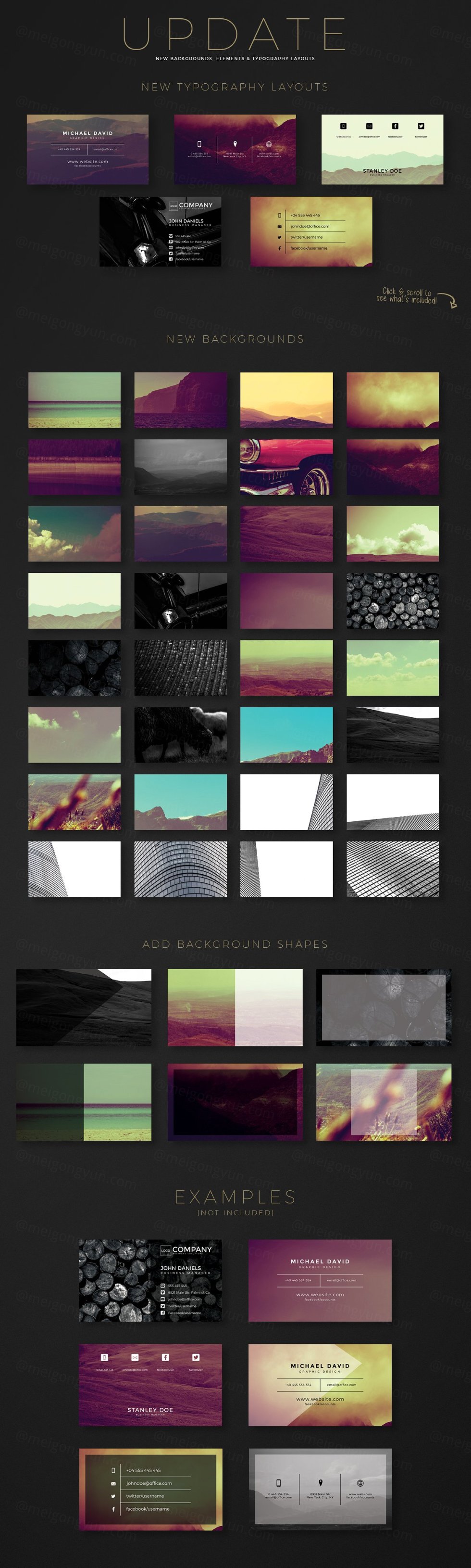 这组合集包括了5个全新排版布局,33个全新背景,它将帮助你为你自己或你的客户制作精美的名片!