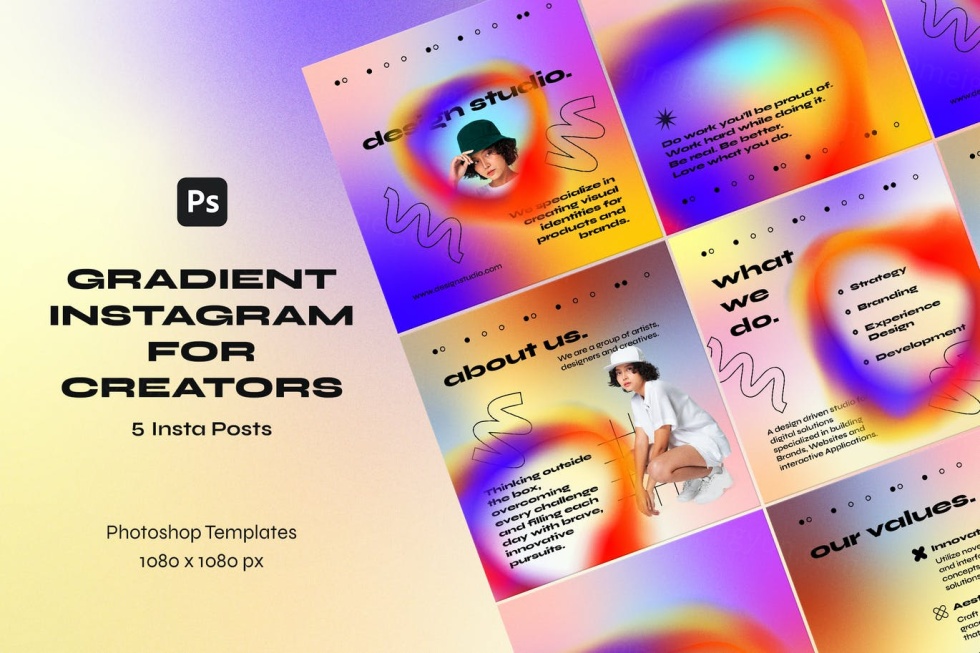专业的 Instagram 模板 为您的 Instagram 或 Facebook 获取一组 5 个很酷的横幅。只需放置您的照片并编辑文本。这简单!酷炫的网格渐变、渐变背景、灯光效果、颗粒纹理。专为现代创作者打造。