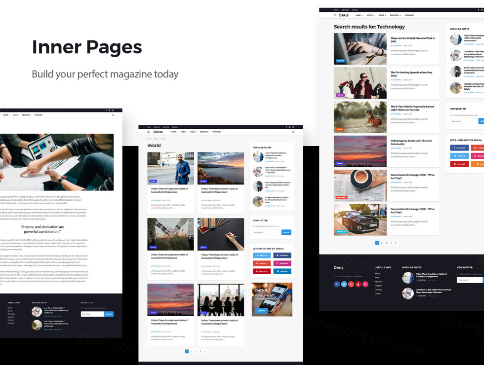 Deus是发行商,大型杂志,报纸,博客和其他新闻网站的理想工具。该模板包含6种预定义的首页样式,6种帖子样式和6种配色方案。Deus超级快并且使用了lazyload技术,因此仅在需要时才加载内容。将Deus用于许多利基市场,例如政治,时尚,游戏,视频,音乐,商业和世界新闻。此HTML5模板基于最新的Bootstrap 4框架,并且具有完全响应能力。整理好的Sass文件将帮助您自定义网站的外观。使用BEM方法和干净的语义代码构建的Deus HTML。立即尝试Deus HTML,打造您的完美杂志。